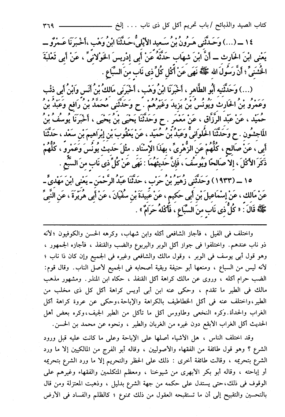 15 - (1933) وَحَدَّثَنِى زُهَيْرُ بْنُ حَرْبٍ، حَدَّثَنَا عَبْدُ الرَّحْمَنِ - يَعْنِى ابْنَ مَهْدِىٍّ - عَنْ مَالِكٍ، عَنْ إِسْمَاعِيلَ بْنِ أَبِى حَكِيمٍ، عَنْ عَبِيدَةَ بْنِ سُفْيَانَ، عَنْ أَبِى هُرَيْرَةَ، عَنِ النَّبِىِّ صَلَّى اللهُ عَلَيْهِ وَسَلَّمَ قَالَ: " كُلُّ ذِى نَابٍ مِنَ السِّبَاعِ، فَأَكْلهُ حَرَامٌ ".