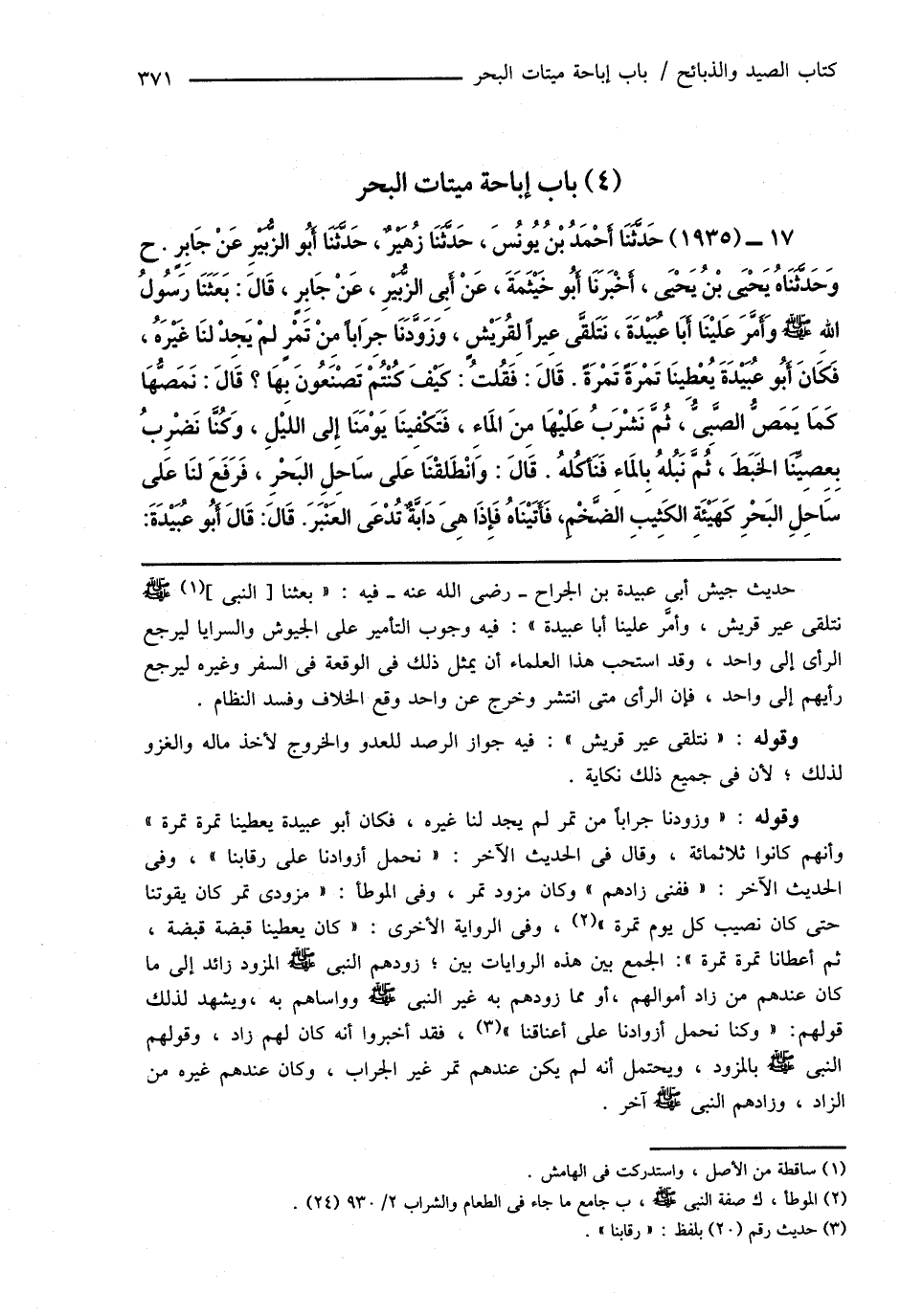 17 - (1935) حَدَّثَنَا أَحْمَدُ بْنُ يُونُسَ، حَدَّثَنَا زُهَيْرٌ، حَدَّثَنَا أَبُو الزُّبَيْرِ عَنْ جَابِرٍ. ح وَحَدَّثَنَاهُ يَحْيَى بْنُ يَحْيَى، أَخْبَرَنَا أَبُو خَيْثَمَةَ، عَنْ أَبِى الزُّبَيْرِ، عَنْ جَابِرٍ، قَالَ: بَعَثَنَا رَسُولُ اللهِ صَلَّى اللهُ عَلَيْهِ وَسَلَّمَ وَأَمَّرَ عَليْنَا أَبَا عُبَيْدَةَ، نَتَلقَّى عِيراً لِقُرَيْشٍ، وَزَوَّدَنَا جِرَاباً مِنْ تَمْرٍ لمْ يَجِدْ لنَا غَيْرَهُ، فَكَانَ أَبُو عُبَيْدَةَ يُعْطِينَا تَمْرَةً تَمْرَةً. قَالَ: فَقُلْتُ: كَيْفَ كُنْتُمْ تَصْنَعُونَ بِهَا؟ قَالَ: نَمَصُّهَا كَمَا يَمَصُّ الصَّبِىُّ، ثُمَّ نَشْرَبُ عَليْهَا مِنَ المَاءِ، فَتَكْفِينَا يَوْمَنَا إِلَى الليْلِ، وَكُنَّا نَضْرِبُ بِعِصِيِّنَا الخَبَطَ، ثُمَّ نَبُلهُ بِالمَاءِ فَنَأَكُلهُ. قَالَ: وَانْطَلقْنَا عَلى سَاحِلِ البَحْرِ، فَرَفَعَ لنَا عَلى سَاحِلِ البَحْرِ كَهَيْئَةِ الكَثِيبِ الضَّخْمِ، فَأَتَيْنَاهُ فَإِذَا هِىَ دَابَّةٌ تُدْعَى العَنْبَرَ. قَالَ: قَالَ أَبُو عُبَيْدَةَ:
