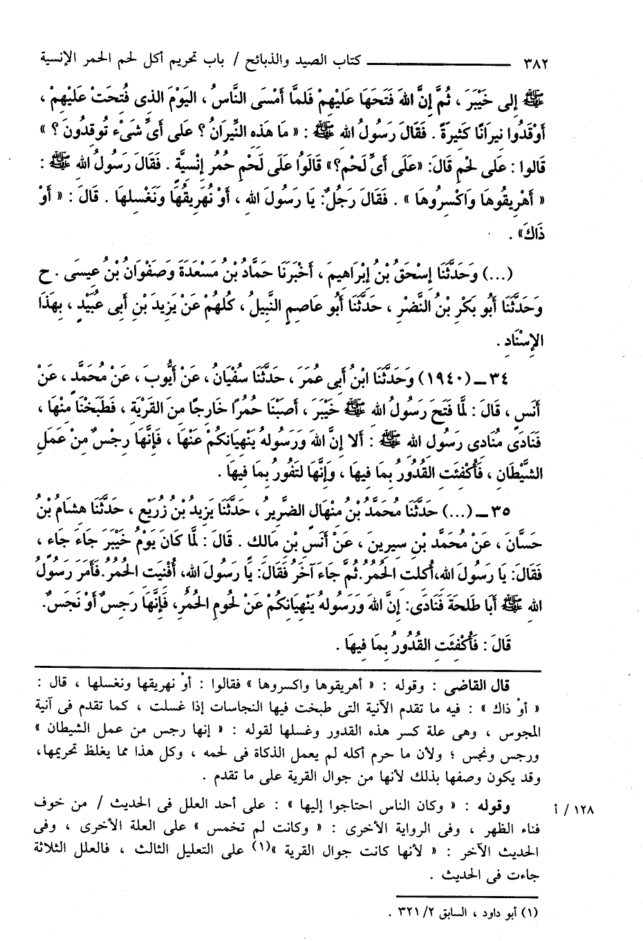 35 - (...) حَدَّثَنَا مُحَمَّدُ بْنُ مِنْهَالٍ الضَّرِيرُ، حَدَّثَنَا يَزِيدُ بْنُ زُرَيْعٍ، حَدَّثَنَا هِشَامُ بْنُ حَسَّانَ، عَنْ مُحَمَّد بْنُ سِيرِينَ، عَنْ أَنَسِ بْنِ مَالِكٍ. قَالَ: لَمَّا كَانَ يَوْمُ خَيْبَرَ جَاءَ جَاءٍ، فَقَالَ: يَا رَسُولَ اللهِ، أُكِلتِ الحُمُرُ. ثُمَّ جَاءَ آخَرُ فَقَالَ: يَا رَسُولَ اللهِ، أُفْنيَتِ الحُمُرُ. فَأَمَرَ رَسُولُ اللهِ صَلَّى اللهُ عَلَيْهِ وَسَلَّمَ أَبَا طَلْحَةَ فَنَادَى: إِنَّ اللهَ وَرسُولهُ يَنْهِيَانِكُمْ عَنْ لحُومِ الحُمُرِ، فَإِنَّهَا رَجِسٌ أَوْ نَجَسٌ. قَالَ: فَأُكْفِئَتِ القُدُورُ بِمَا فِيهَا.