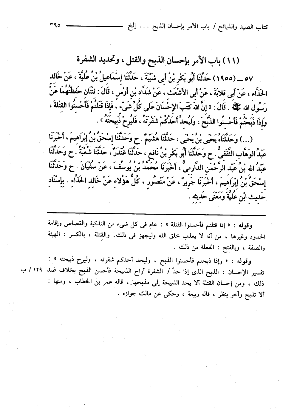 57 - (1955) حَدَّثَنَا أَبُو بَكْرِ بْنُ أَبِى شَيْبَةَ، حَدَّثَنَا إِسْمَاعِيلُ بْنُ عُليَّةَ، عَنْ خَالِدٍ الحَذَّاءِ، عَنْ أَبِى قِلابَةَ، عَنْ أَبِى الأَشْعَثِ، عَنْ شَدَّادِ بْنِ أَوْسٍ، قَالَ: ثِنْتَانِ حَفِظْتُهُمَا عَنْ رَسُولِ اللهِ صَلَّى اللهُ عَلَيْهِ وَسَلَّمَ. قَالَ: " إِنَّ اللهَ كَتَبَ الإِحْسَانَ عَلى كُلِّ شَىْءٍ، فَإِذَا قَتَلتُمْ فَأَحْسِنُوا القِتْلةَ، وَإِذَا ذَبَحْتُمْ فَأَحْسِنُوا الذَّبْحَ، وَليُحِدَّ أَحَدُكُمْ شَفْرَتَهُ، فَليُرِحْ ذَبِيحَتَهُ ".