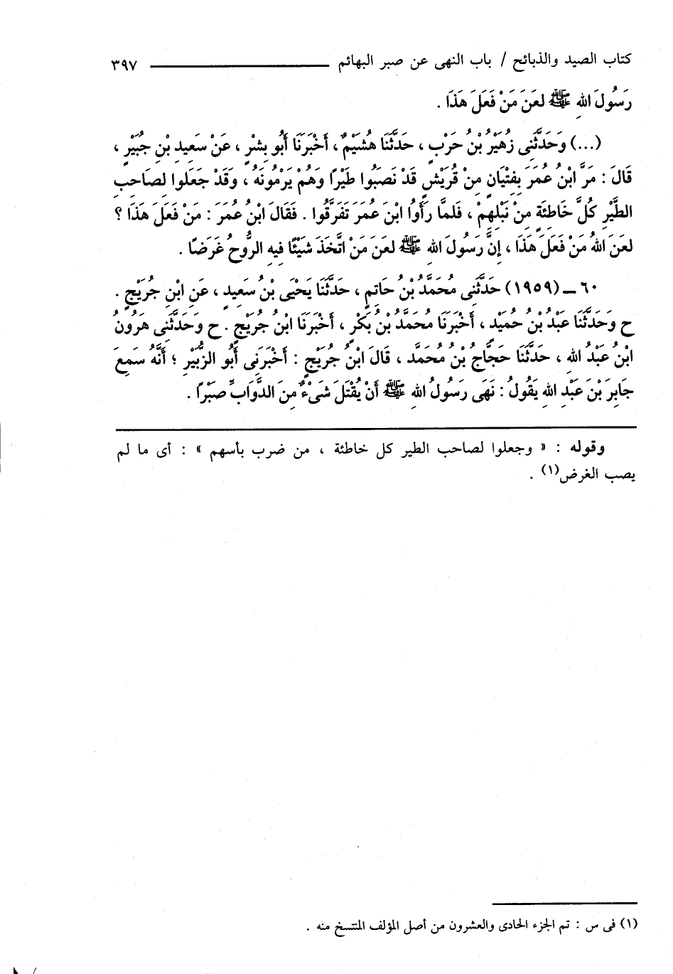 (...) وَحَدَّثَنِى زُهَيْرُ بْنُ حَرْبٍ، حَدَّثَنَا هُشَيْمٌ، أَخْبَرَنَا أَبُو بِشْرٍ، عَنْ سَعِيدِ بْنِ جُبَيْرٍ، قَالَ: مَرَّ ابْنُ عُمَرَ بِفِتْيَانٍ مِنْ قُرَيْشٍ قَدْ نَصَبُوا طَيْرًا وَهُمْ يَرْمُونَهُ، وَقَدْ جَعَلوا لِصَاحِبِ الطَّيْرِ كُلَّ خَاطِئَةٍ مِنْ نَبْلِهِمْ، فَلمَّا رَأَوُا ابْنَ عُمَرَ تَفَرَّقُوا. فَقَالَ ابْنُ عُمَرَ: مَنْ فَعَلَ هَذَا؟ لعَنَ اللهُ مَنْ فَعَلَ هَذَا، إِنَّ رسُولَ اللهِ صَلَّى اللهُ عَلَيْهِ وَسَلَّمَ لعَنَ مَنْ اتَّخَذَ شَيْئًا فِيهِ الرُّوحُ غَرَضًا.