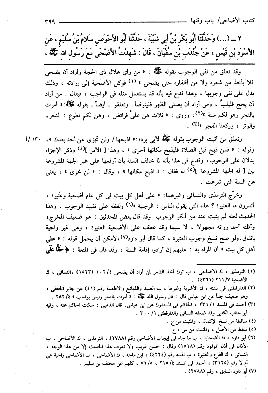 (¬6) أبو داود، ك الضحايا، ب ما جاء فى إيجاب الأضاحى رقم (2788)، الترمذى، ك الأضاحى، ب الأذان فى أذن المولود رقم (1518) وقال: حسن غريب ولا نعرف هذا الحديث إلا من هذا الوجه، النسائى، ك الفرع والعتيرة، ب نفسه رقم (4224)، ابن ماجه، ك الأضاحى، ب الأضاحى واجبة هى أم لا رقم (3125)، أحمد فى المسند 4/ 215، 5/ 76، كلهم عن مخنف بن سليم.