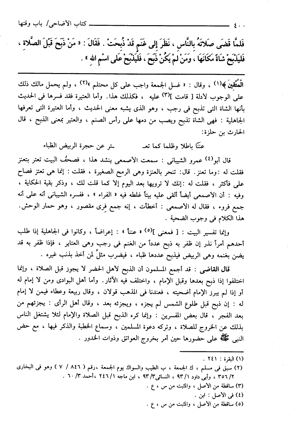 الْمُتَّقِينَ} (¬1)، وقال: " غسل الجمعة واجب على كل محتلم " (¬2)، ولم يحمل مالك ذلك على الوجوب لأدلة [قامت] (¬3) عليه، فكذلك هذا. وأما العتيرة فقد فسرها فى الحديث بأنها الشاة التى تذبح فى رجب، وهو الذى يشبه معنى الحديث، وأما العتيرة التى تعرفها الجاهلية: فهى الشاة تذبح ويصب من دمها على رأس الصنم، والعتير بمعنى الذبح، قال الحارث بن حلزة: