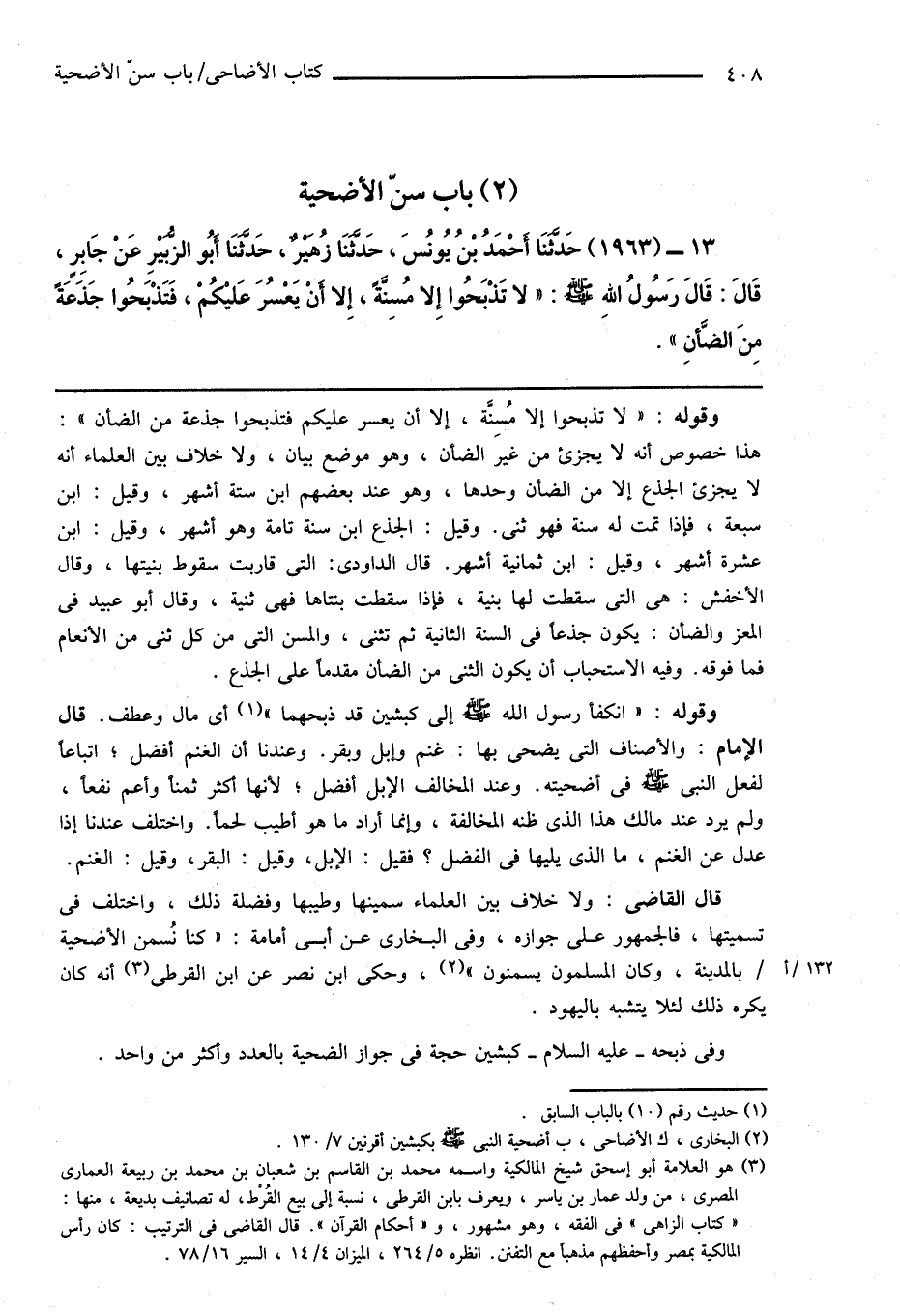 13 - (1963) حَدَّثَنَا أَحْمَدُ بْنُ يُونُسَ، حدثنا زهير، حَدَّثَنَا أَبُو الزُّبَيْرِ عَنْ جَابِرٍ، قَالَ: قَالَ رَسُولُ اللهِ صَلَّى اللهُ عَلَيْهِ وَسَلَّمَ: " لا تَذْبَحُوا إِلا مُسِنَّةً، إِلا أَنْ يَعْسُرَ عَليْكُمْ، فَتَذْبَحُوا جَذَعَةً مِنَ الضَّأنِ ".