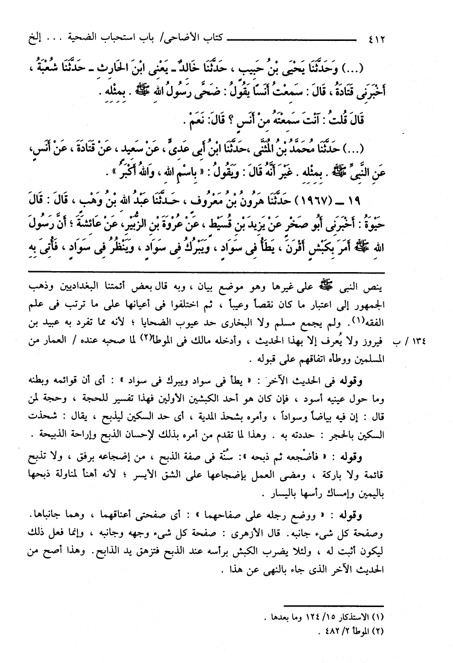 19 - (1967) حَدَّثَنَا هَارُونُ بْنُ مَعْرُوفٍ، حَدَّثَنَا عَبْدُ اللهِ بْنُ وَهْبٍ، قَالَ: قَالَ حَيْوَةُ: أَخْبَرَنِى أَبُو صَخْرٍ عَنْ يَزِيدَ بْنِ قُسَيْطٍ، عَنْ عُرْوَةَ بْنِ الزُّبَيْرِ، عَنْ عَائِشَةَ؛ أَنَّ رَسُولَ اللهِ صَلَّى اللهُ عَلَيْهِ وَسَلَّمَ أَمَرَ بِكَبْشٍ أَقْرَنَ، يَطَأُ فِى سَوَادٍ، وَيَبْرُكُ فِى سَوَادٍ، وَيَنْظُرُ فِى سَوَادٍ، فَأُتِىَ بِهِ