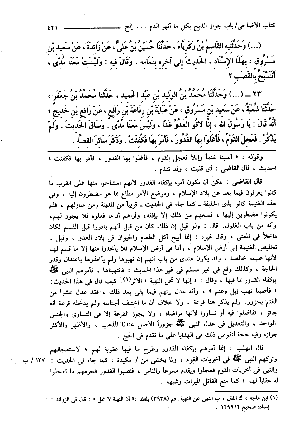 (...) وَحَدَّثَنِيهِ القَاسِمُ بْنُ زَكَرِيَّاءَ، حَدَّثَنَا حُسَيْنُ بْنُ عَلِىٍّ، عَنْ زَائِدَةَ، عَنْ سَعِيدِ بْنِ مَسْرُوقٍ، بِهَذَا الإِسْنَادِ، الحَدِيثَ إِلَى آخِرِهِ بِتَمَامِه. وَقَالَ فِيهِ: وَليْسَتْ مَعَنَا مُدًى، أَفَنَذْبَحُ بِالقَصَبِ؟