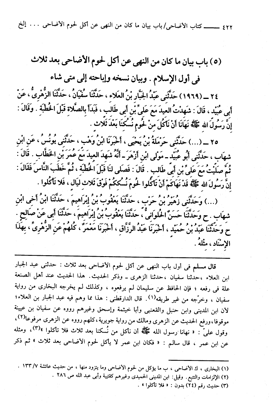 (5) باب بيان ما كان من النهى عن أكل لحوم الأضاحى بعد ثلاث فى أول الإسلام. وبيان نسخه وإباحته إلى متى شاء
