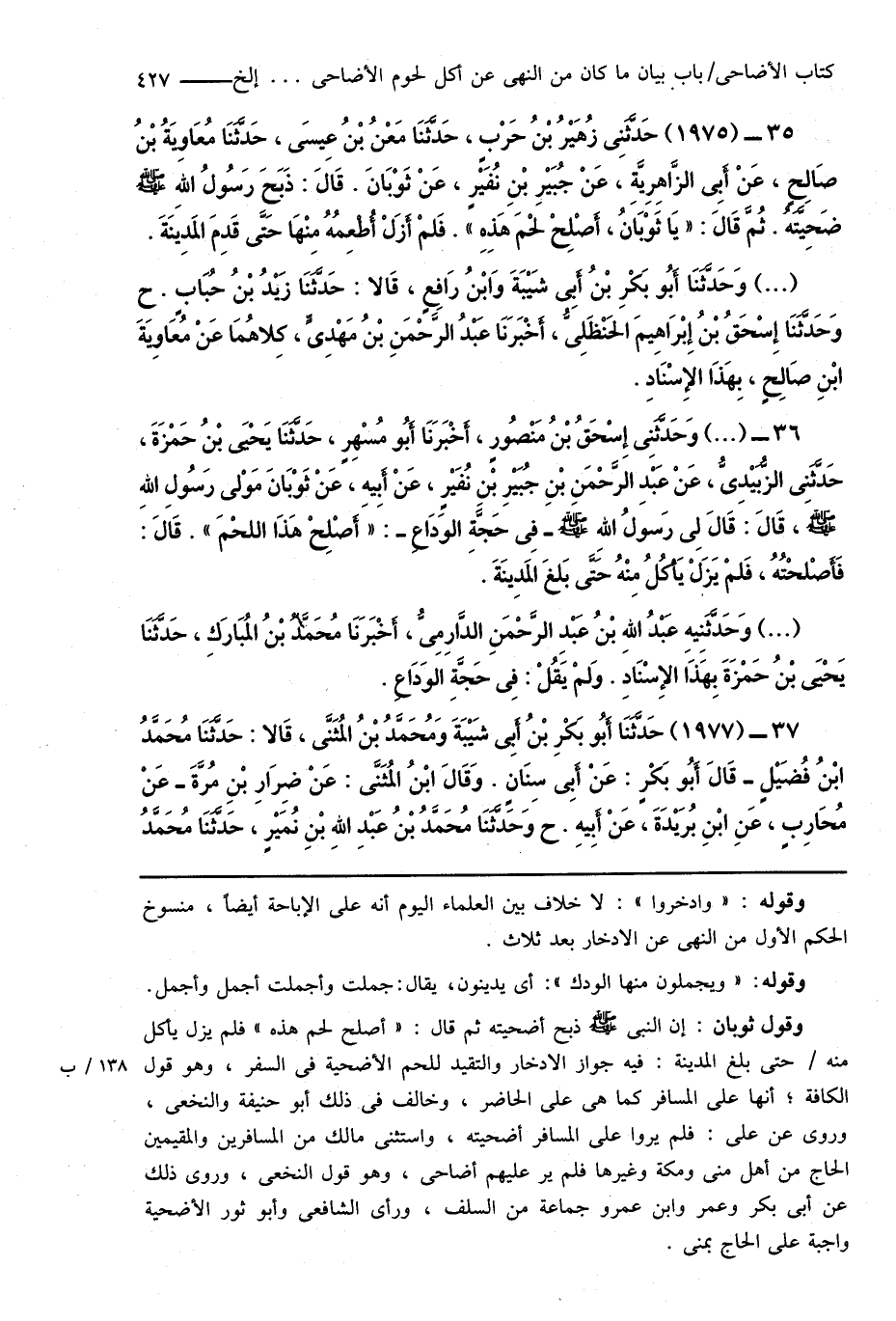 35 - (1975) حَدَّثَنِى زُهَيْرُ بْنُ حَرْبٍ، حَدَّثَنَا مَعْنُ بْنُ عِيسَى، حَدَّثَنَا مُعَاوِيَةُ بْنُ صَالِحٍ، عَنْ أَبِى الزَّاهِرِيَّةِ، عَنْ جُبَيْرِ بْنِ نُفَيْرٍ، عَنْ ثَوْبَانَ. قَالَ: ذَبَحَ رَسُولُ اللهِ صَلَّى اللهُ عَلَيْهِ وَسَلَّمَ ضَحِيَّتَهُ. ثُمَّ قَالَ: " يَا ثَوْبَانُ، أَصْلِحْ لحْمَ هَذِهِ ". فَلمْ أَزَلْ أُطْعِمُهُ مِنْهَا حَتَّى قَدِمَ المَدِيَنَةَ.