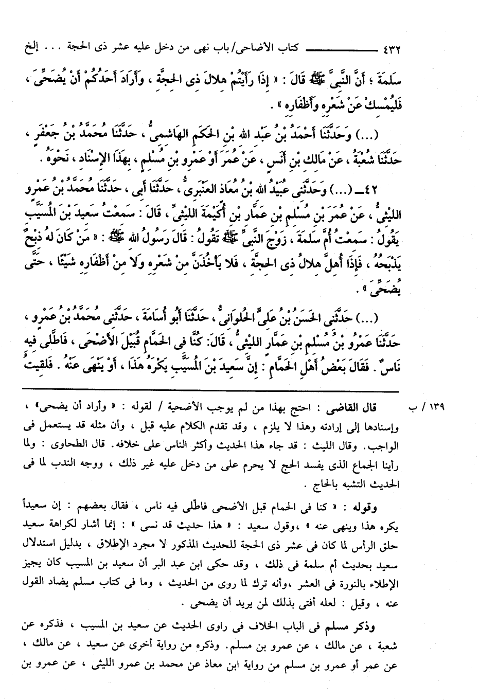 وقوله: " كنا فى الحمام قبل الأضحى فاطّلى فيه ناس، فقال بعضهم: إن سعيداً يكره هذا وينهى عنه "، وقول سعيد: " هذا حديث قد نسى ": إنما أشار لكراهة سعيد حلق الرأس لما كان فى عشر ذى الحجة للحديث المذكور لا مجرد الإطلاق، بدليل استدلال سعيد بحديث أم سلمة فى ذلك، وقد حكى ابن عبد البر أن سعيد بن المسيب كان يجيز الإطلاء بالنورة فى العشر، وأنه ترك لما روى من الحديث، وما فى كتاب مسلم يضاد القول عنه، وقيل: لعله أفتى بذلك لمن يريد أن يضحى.