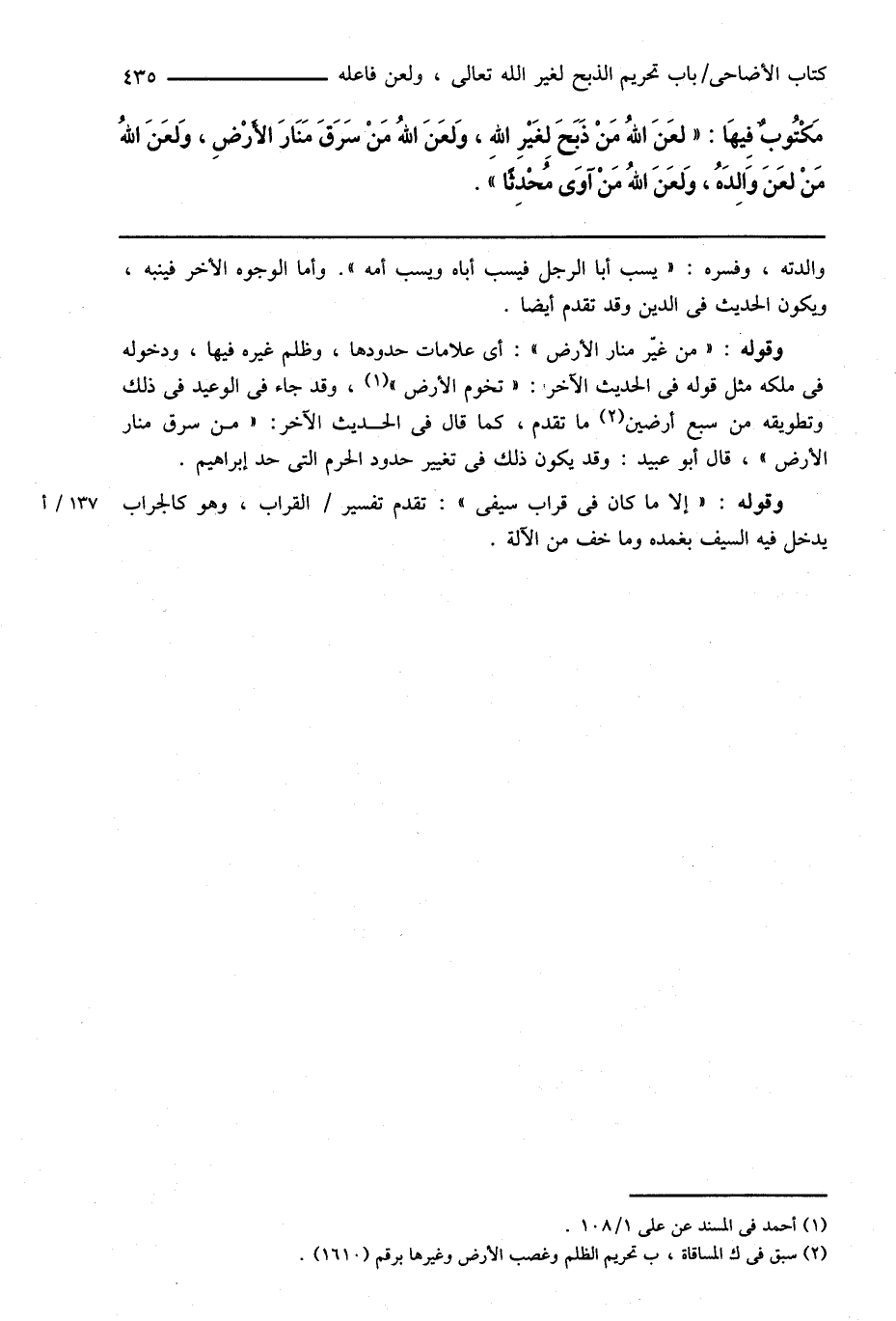 مَكْتُوبٌ فِيهَا: " لعَنَ اللهُ مَنْ ذَبَحَ لِغَيْرِ اللهِ، وَلعَنَ اللهُ مَنْ سَرَقَ مَنَارَ الأَرْضِ، وَلعَنَ اللهُ مَنْ لعَنَ وَالِدَهُ، وَلعَنَ اللهُ مَنْ آوَى مُحْدِثًا ".