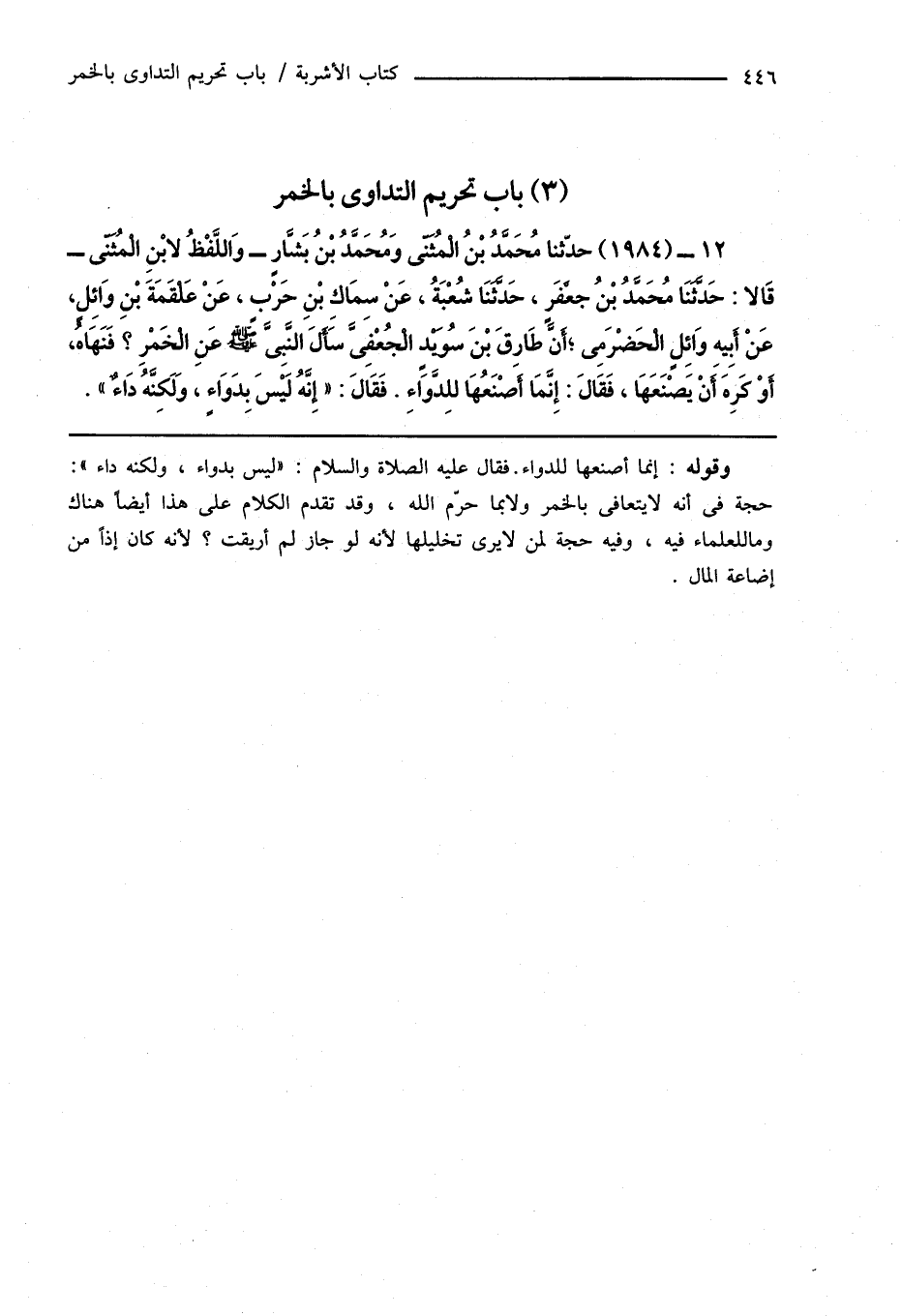 12 - (1984) حدَّثنا مُحَمَّدُ بْنُ الْمُثَنَّى وَمُحَمَّدُ بْنُ بَشَّارٍ - وَاللَّفْظُ لابْنِ الْمُثَنَّى - قَالا: حَدَّثَنَا مُحَمَّدُ بْنُ جَعْفَرٍ، حَدَّثَنَا شُعْبَةُ، عَنْ سِمَاكِ بْنِ حَرْبٍ، عَنْ عَلْقَمَةَ بْنِ وَائِلٍ، عَنْ أَبِيهِ وَائِلٍ الْحَضْرَمِى؛ أَنَّ طَارِقَ بْنَ سُوَيْدٍ الْجُعْفَىَّ سَأَلَ النَّبِىَّ صَلَّى اللهُ عَلَيْهِ وَسَلَّمَ عَنِ الْخَمْرِ؟ فَنَهَاهُ، أَوْ كَرِهَ أَنْ يَصْنَعَهَا، فَقَالَ: إِنَّمَا أَصْنَعُهَا للِدَّوَاءِ. فَقَالَ: " إِنَّهُ لَيْسَ بِدَوَاءٍ، وَلَكِنَّهُ دَاءٌ ".