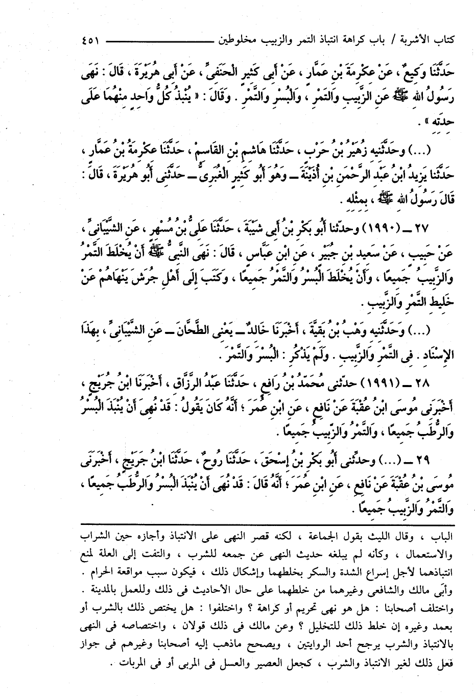 28 - (1991) حدّثنى مُحَمَّدُ بْنُ رَافِعٍ، حَدَّثَنَا عَبْدُ الرَّزَّاقِ، أَخْبَرَنَا ابْنُ جُرَيْجٍ، أَخْبَرَنِى مُوسَى ابْنُ عُقْبَةَ عَنْ نَافِعٍ، عَنِ ابْنِ عُمَرَ؛ أَنَّهُ كَانَ يَقُولُ: قَدْ نُهِىَ أَنْ يُنْبَذَ البُسْرُ وَالرُّطَبُ جَمِيعًا، وَالتَّمْرُ وَالزَّبِيبُ جَمِيعًا.