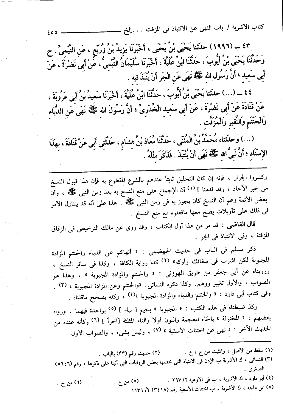 43 - (1996) حدَّثنا يَحْيَى بْنُ يَحْيَى، أَخْبَرَنَا يَزِيدُ بْنُ زُرَيْعٍ، عَنِ التَّيْمِىِّ. ح وَحَدَّثَنَا يَحْيَى بْنُ أَيُّوبَ، حَدَّثَنَا ابْنُ عُلَيَّةَ، أَخْبَرَنَا سُلَيْمَانُ التَّيْمِىُّ، عَنْ أَبِى نَضْرَةَ، عَنْ أَبِى سَعِيدٍ؛ أَنَّ رَسُولَ اللهِ صَلَّى اللهُ عَلَيْهِ وَسَلَّمَ نَهَى عَنِ الْجَر أَنْ يُنْبَذَ فِيهِ.