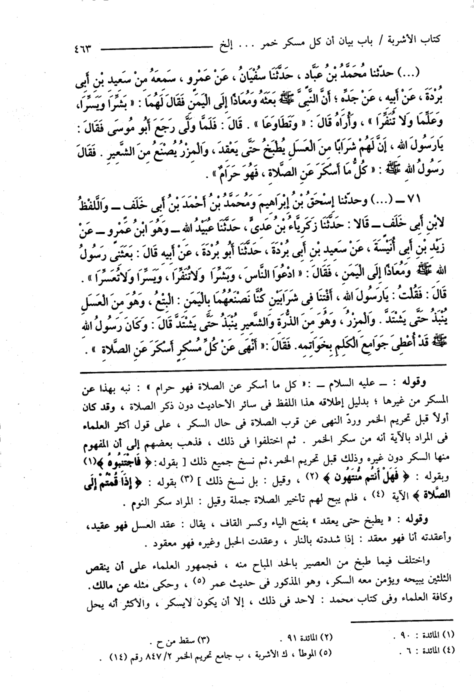 71 - (...) وحدّثنا إِسْحَاقُ بْنُ إِبْرَاهِيمَ وَمُحَمَّدُ بْنُ أَحْمَدَ بْنُ أَبِى خَلَفٍ - وَاللَّفْظُ لابْنِ أَبِى خَلَفٍ - قَالا: حَدَّثَنَا زَكَرِيَّاءُ بْنُ عَدِىٍّ، حَدَّثَنَا عُبَيْدُ اللهِ - وَهُوَ ابْنُ عَمْرٍو - عَنْ زَيْدِ بْنِ أَبِى أُنَيْسَةَ، عَنْ سَعِيدِ بْنِ أَبِى بُرْدَةَ، حَدَّثَنَا أَبُو بُرْدَةَ، عَنْ أَبِيهِ قَالَ: بَعَثَنِى رَسُولُ اللهِ صَلَّى اللهُ عَلَيْهِ وَسَلَّمَ وَمُعَاذًا إِلَى الْيَمَنِ، فَقَالَ: " ادْعُوَا النَّاسَ، وَبَشِّرَا وَلا تُنَفِّرَا، وَيَسِّرَا وَلا تُعَسِّرَا ". قَالَ: فَقُلْتُ: يَا رَسُولَ اللهِ، أَفْتِنَا فِى شَرَابَيْنِ كُنَّا نَصْنَعُهُمَا بِالْيَمَنِ: الْبِتْعُ، وَهُوَ مِنَ الْعَسَلِ يُنْبَذُ حَتَّى يَشْتَدَّ. وَالْمِزْرُ، وَهُوَ مِنَ الذُّرَةِ وَالشَّعِيرِ يُنْبَذُ حَتَّى يَشْتَدَّ قَالَ: وَكَانَ رَسُولُ اللهِ صَلَّى اللهُ عَلَيْهِ وَسَلَّمَ قَدْ أُعْطِىَ جَوَامِعَ الْكَلِمِ بِخَوَاتِمِه. فَقَاَلَ: " أَنْهَى عَنْ كُلِّ مُسْكِرٍ أَسْكَرَ عَنِ الصَّلاةِ ".