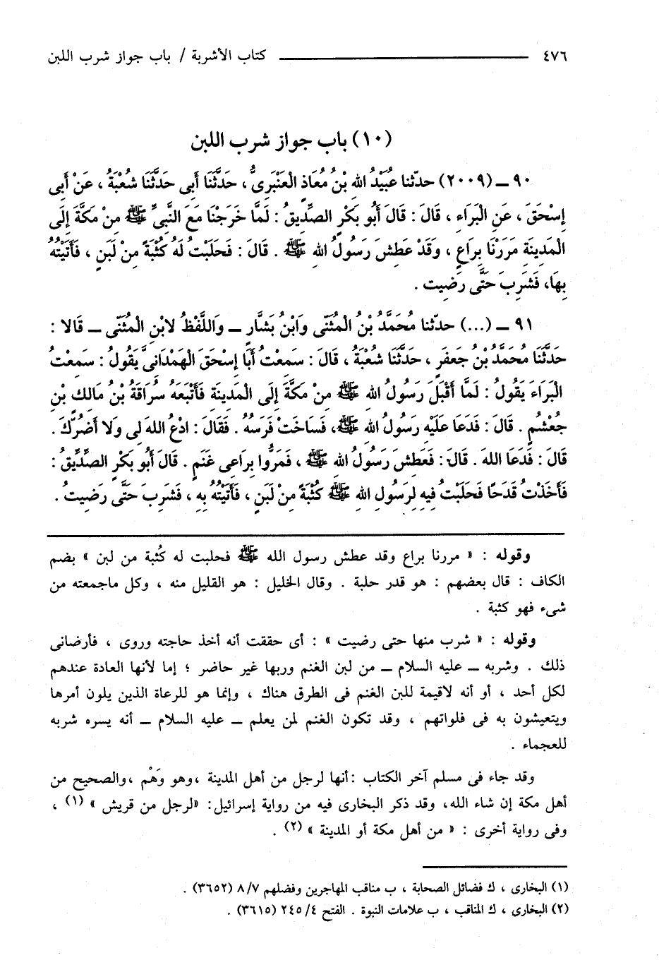 90 - (2009) حدَّثنا عُبَيْدُ اللهِ بْنُ مُعَاذٍ الْعَنْبَرِىُّ، حَدَّثَنَا أَبِى، حَدَّثَنَا شُعْبَةُ، عَنْ أَبِى إِسْحَاقَ، عَنِ الْبَرَاءِ، قَالَ: قَالَ أَبُو بَكْرٍ الصِّدِّيقُ: لَمَّا خَرَجْنَا مَعَ النَّبِىِّ صَلَّى اللهُ عَلَيْهِ وَسَلَّمَ مِنْ مَكَّةَ إِلَى الْمَدِينَةِ مَرَرْنَا بِرَاعٍ، وَقَدْ عَطِشَ رَسُولُ اللهِ صَلَّى اللهُ عَلَيْهِ وَسَلَّمَ. قَالَ: فَحَلَبْتُ لَهُ كُثْبَةً مِنْ لَبَنٍ، فَأَتَيْتُهُ بِهَا، فَشَرِبَ حَتَّى رَضِيت.