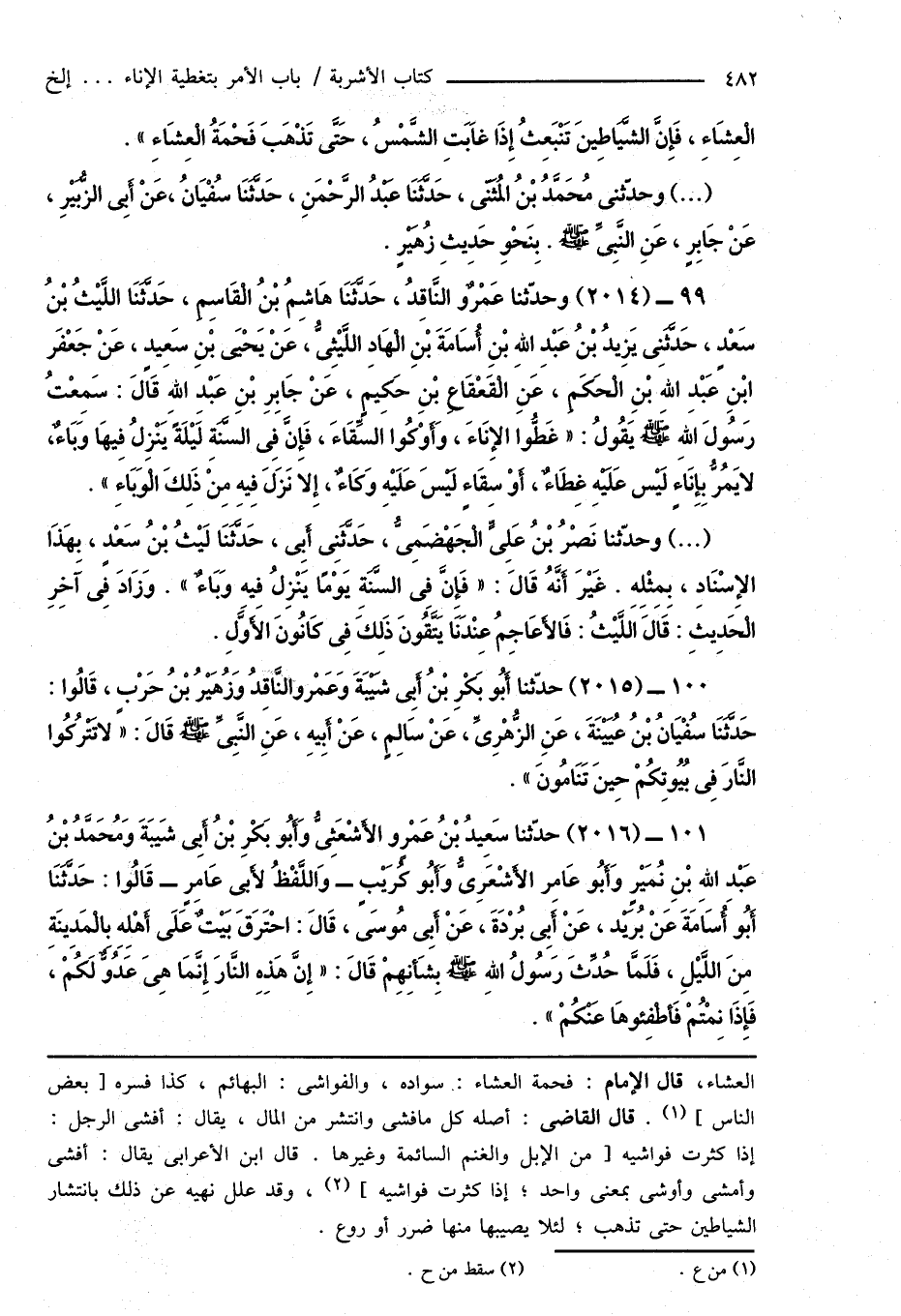 99 - (2014) وحدّثنا عَمْرٌو النَّاقِدُ، حَدَّثَنَا هَاشِمُ بْنُ الْقَاسِمِ، حَدَّثَنَا اللَّيْثُ بْنُ سَعْدٍ، حَدَّثَنِى يَزِيدُ بْنُ عَبْدِ اللهِ بْنِ أُسَامَةَ بْنِ الْهَادِ اللَّيْثِىُّ، عَنْ يَحْيَى بْنِ سَعِيدٍ، عَنْ جَعْفَر ابْنِ عَبْدِ اللهِ بْنِ الْحَكَمِ، عَنِ الْقَعْقَاعِ بْنِ حَكِيَمٍ، عَنْ جَابِرِ بْنِ عَبْدِ اللهِ قَالَ: سَمِعْتُ رَسُولَ اللهِ صَلَّى اللهُ عَلَيْهِ وَسَلَّمَ يَقُولُ: " غَطُّوا الإِنَاءَ، وَأَوْكُوا السِّقَاءَ، فَإنَّ فِى السَّنَةِ لَيْلَةً يَنْزِلُ فِيهَا وَبَاءٌ، لا يَمُرُّ بِإِنَاءٍ لَيْس عَلَيْهِ غِطَاءٌ، أَوْ سِقَاءٍ لَيْسَ عَلَيْهِ وكَاءٌ، إِلاَ نَزَلَ فِيهِ مِنْ ذَلِكَ الْوَبَاءِ ".