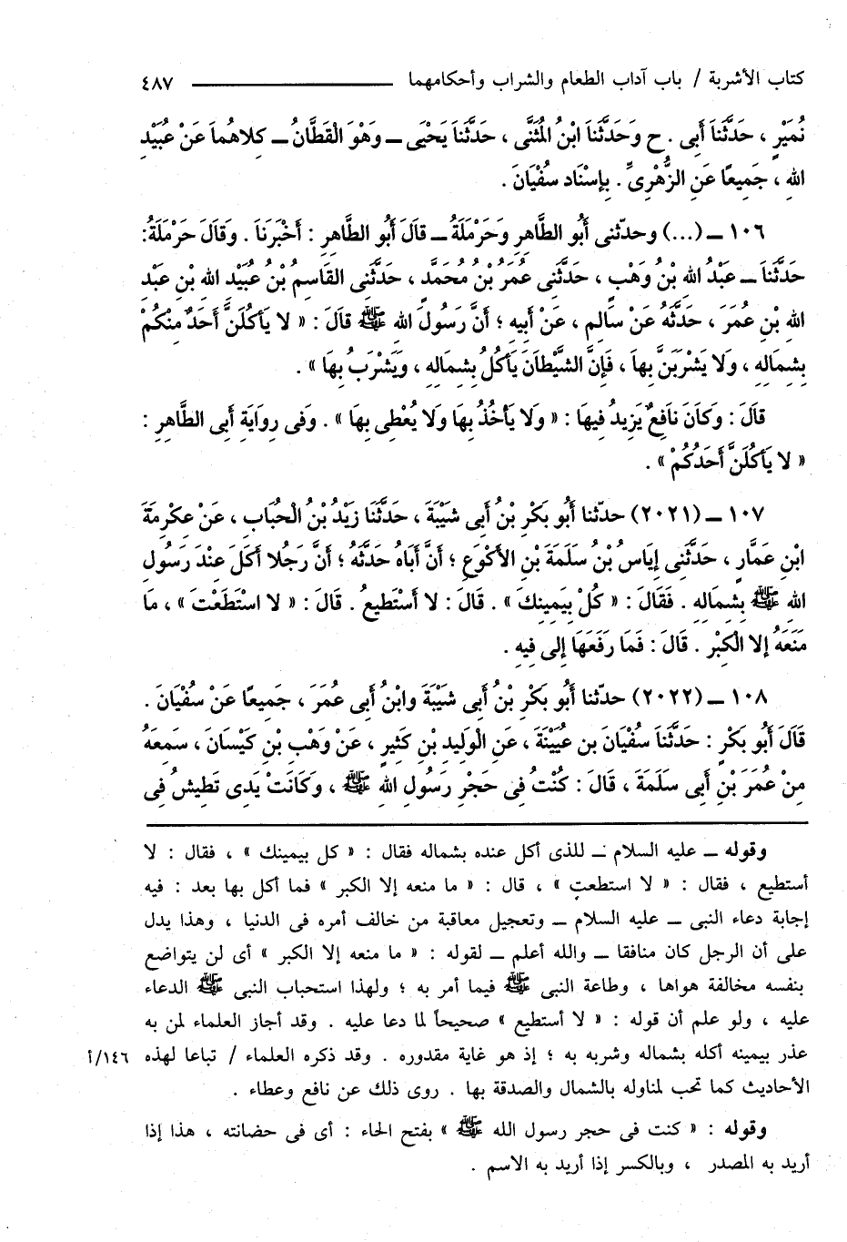 106 - (...) وحدّثنى أَبُو الطَّاهِرِ وَحَرْمَلَةُ - قَالَ أَبُو الطَّاهِرِ: أَخْبَرَنَا. وَقَالَ حَرْمَلَةُ: حَدَّثَنَا - عَبْدُ اللهِ بْنُ وَهْبٍ، حَدَّثَنِى عُمَرُ بْنُ مُحَمَّدٍ، حَدَّثَنِى القَاسِمُ بْنُ عُبَيْدِ اللهِ بْنِ عَبْدِ اللهِ بْنِ عُمَرَ، حَدَّثَهُ عَنْ سَالِم، عَنْ أَبِيهِ؛ أَنَّ رَسُولُ اللهِ صَلَّى اللهُ عَلَيْهِ وَسَلَّمَ قاَلَ: " لا يَأكُلَنَّ أَحَدٌ مِنْكُمْ بِشِمَالِهِ، وَلا يَشْرَبَنَّ بِهَا، فَإِن الشَّيْطَانَ يَأكُلُ بِشِمَالِهِ، وَيَشْرَبُ بِهَا ".