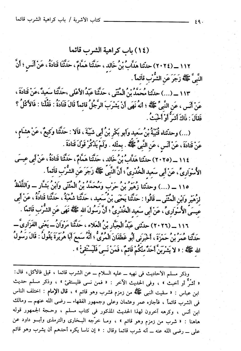 112 - (2024) حدَّثنا هَدَّابُ بْنُ خَالِدٍ، حَدَّثَنَا هَمَّامٌ، حَدَّثَنَا قَتَادَةُ، عَنْ أَنَسٍ؛ أَنَّ النَبِىَّ صَلَّى اللهُ عَلَيْهِ وَسَلَّمَ زَجَرَ عَنِ الشُّرْبِ قاَئِماً.