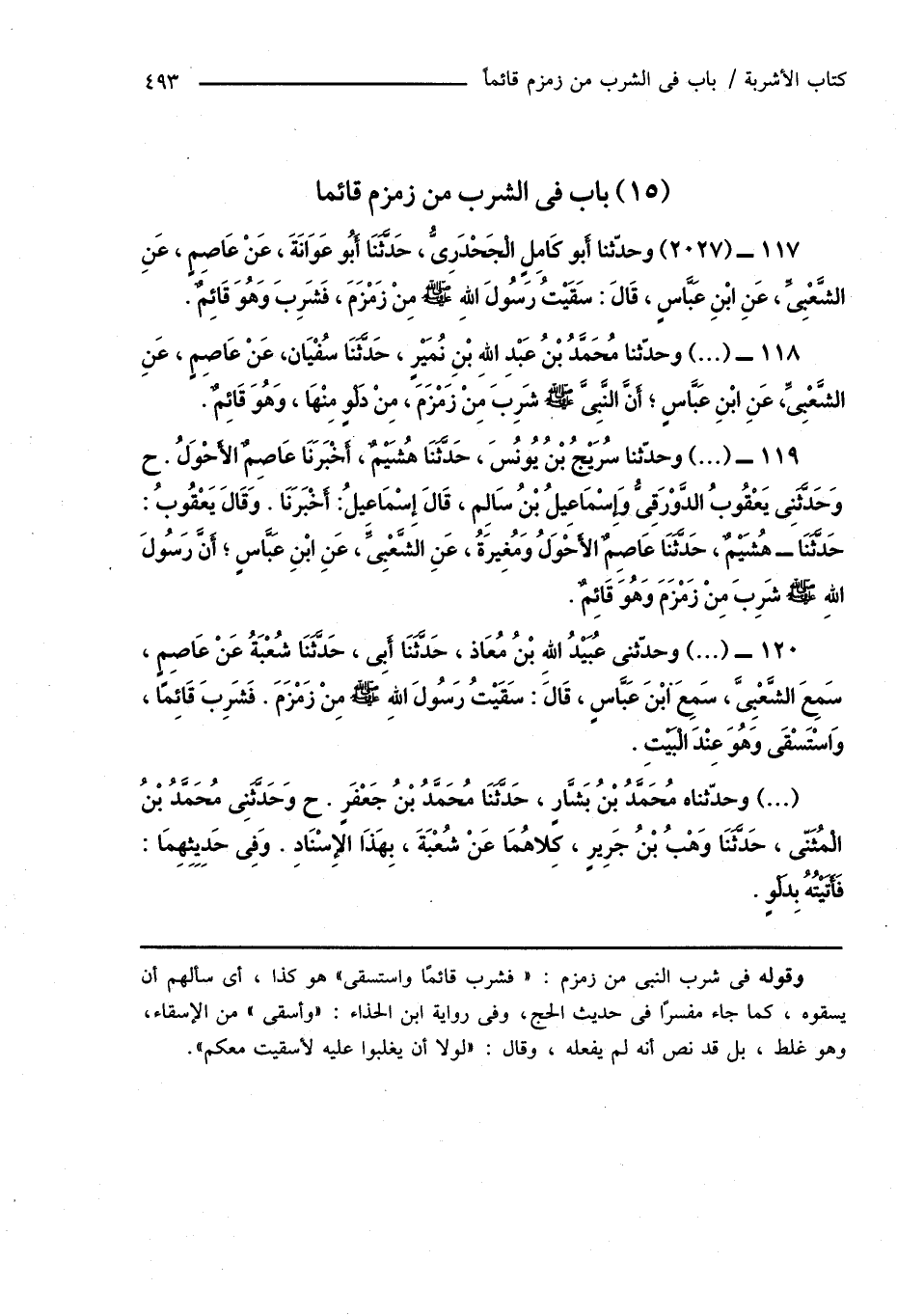 118 - (...) وحدّثنا مُحَمَّدُ بْنُ عَبْدِ اللهِ بْنِ نُمَيْرٍ، حَدَّثَنَا سُفْيَان، عَنْ عَاصِمٍ، عَنِ الشَّعْبِىِّ عَنِ ابْنِ عَبَّاسٍ؛ أَنَّ النَّبِىَّ صَلَّى اللهُ عَلَيْهِ وَسَلَّمَ شَرِبَ مِنْ زَمْزَمَ، مِنْ دَلْوٍ مِنْهَا، وَهُوَ قَائِمٌ.