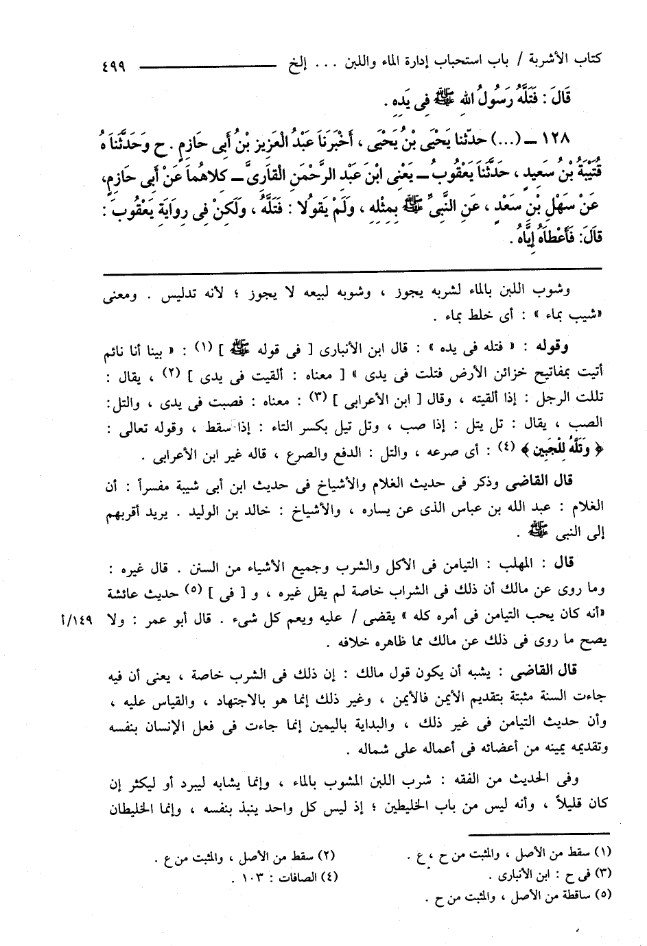 128 - (...) حدَّثنا يَحْيَى بْنُ يَحْيَى، أَخْبَرَنَا عَبْدُ الْعَزِيز بْنُ أَبِى حَازِمٍ. ح وَحَدَّثَنَاهُ قُتَيْبَةُ بْنُ سَعِيدٍ، حَدَّثَنَا يَعْقُوبُ - يَعْنِى ابْنَ عَبْدِ الرَّحْمَنِ الْقَارِىَّ - كِلاهُمَا عَنْ أَبِى حَازِمٍ، عَنْ سَهْلِ بْنِ سَعْدٍ، عَنِ النَّبِىِّ صَلَّى اللهُ عَلَيْهِ وَسَلَّمَ بِمِثْلِهِ، وَلَمْ يَقُولا: فَتَلَّهُ، وَلَكِنْ فِى رِوَايَةِ يَعْقُوبَ: قَالَ: فَأَعْطَاهُ إِيَّاهُ.