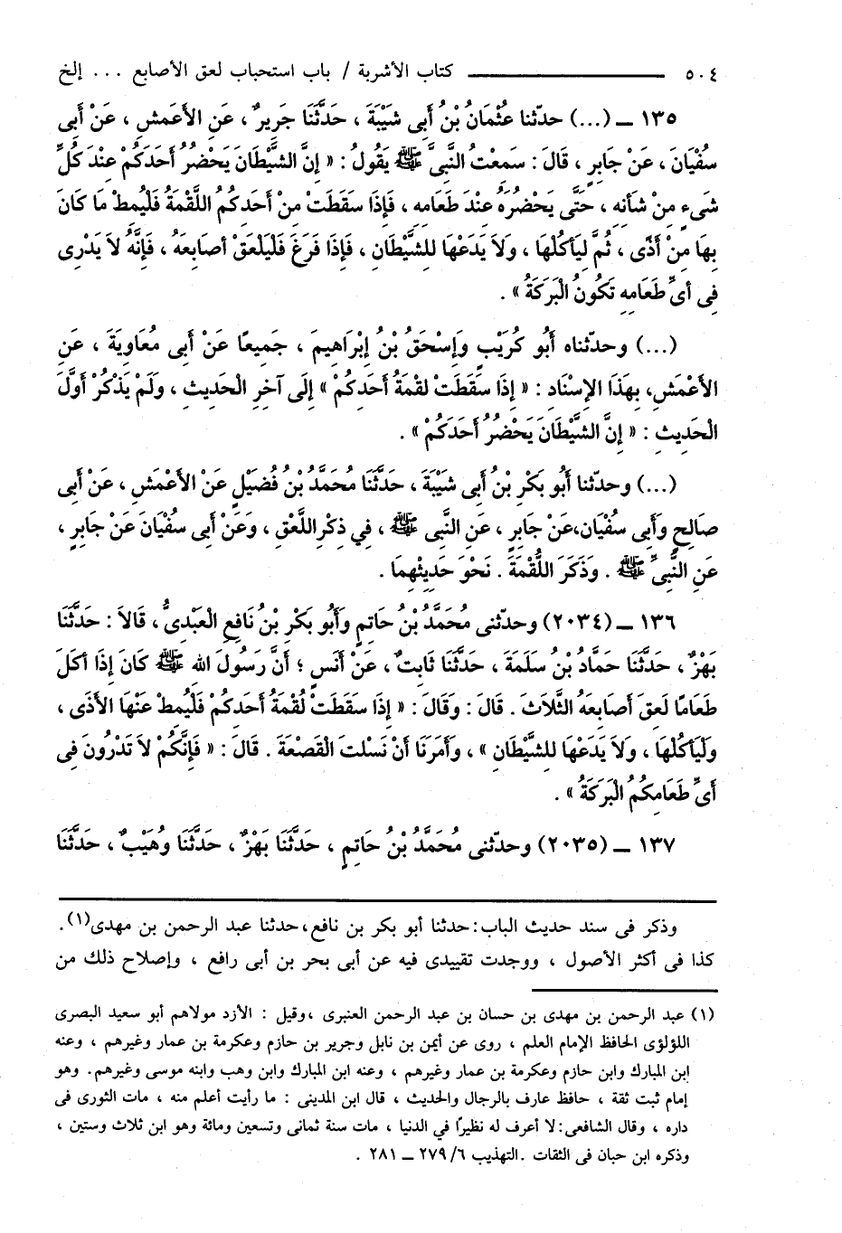 135 - (...) حدَّثنا عُثْمَانُ بْنُ أَبِى شَيْبَةَ، حَدَّثَنَا جَرِيرٌ، عَنِ الأَعْمَشِ، عَنْ أَبِى سُفْيَانَ، عَنْ جَابِرٍ، قَالَ: سَمِعْتُ النَّبِىَّ صَلَّى اللهُ عَلَيْهِ وَسَلَّمَ يَقُولُ: " إِنَّ الشَّيْطَانَ يَحْضُرُ أَحَدَكُمْ عِنْدَ كُلِّ شَىْءٍ مِنْ شَأنِهِ، حَتَّى يَحْضُرَهُ عِنْدَ طَعَامِهِ، فَإِذَا سَقَطَتْ مِنْ أَحَدِكُمُ اللُّقمَةُ فَلْيُمِطْ مَا كَانَ بِهَا مَنْ أَذَى، ثُمَّ لِيَأكُلْهَا، وَلا يَدَعْهَا للِشَّيْطَانِ، فَإِذَا فَرَغَ فَلْيَلْعَقْ أَصَابِعَهُ، فَإِنَّهُ لا يَدْرِى فِى أَىِّ طَعَامِهِ تَكُونُ الْبَرَكَةُ ".