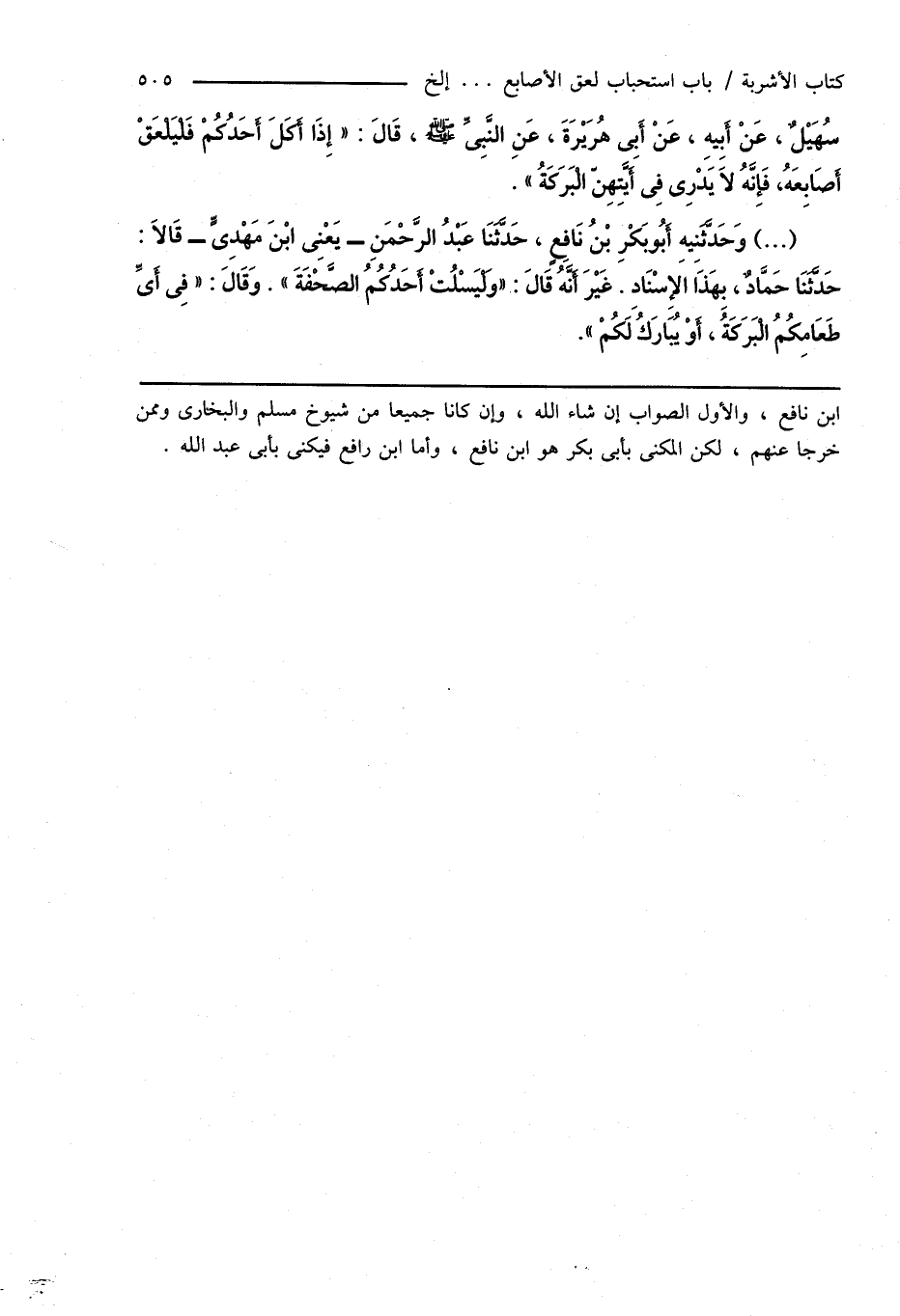 (...) وَحَدَّثَنِيهِ أَبُو بَكْرِ بْنُ نَافِعٍ، حَدَّثَنَا عَبْدُ الرَّحْمَنِ - يَعْنِى ابْنَ مَهْدِىٍّ - قَالا: حَدَّثَنَا حَمَّادٌ، بِهَذَا الإِسْنَادِ. غَيْرَ أَنَّهُ قَالَ:. " وَلْيَسْلُتْ أَحَدُكُمُ الصَّحْفَةَ ". وَقَالَ: " فِى أَىِّ طَعَامِكُمُ الْبَرَكَةُ، أَوْ يُبَارَكُ لَكُمْ ".