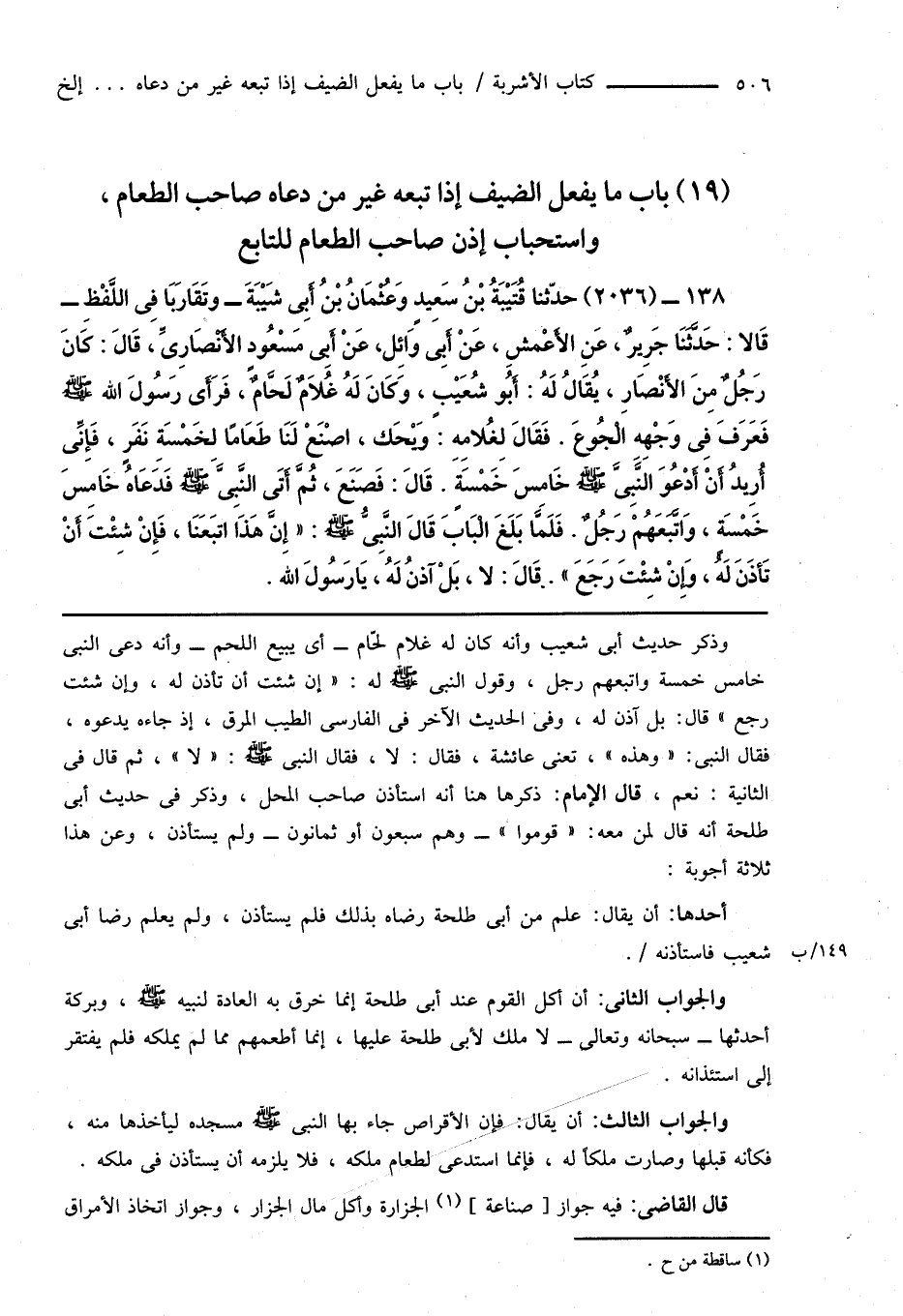 وذكر حديث أبى شعيب وأنه كان له غلام لحّام - أى يبيع اللحم - وأنه دعى النبى خامس خمسة واتبعهم رجل، وقول النبى صَلَّى اللهُ عَلَيْهِ وَسَلَّمَ له: " إن شئت أن تأذن له، وإن شئت رجع " قال: بل آذن له، وفى الحديث الآخر فى الفارسى الطيب المرق، إذ جاءه يدعوه، فقال النبى: " وهذه "، تعنى عائشة، فقال: لا، فقال النبى صَلَّى اللهُ عَلَيْهِ وَسَلَّمَ: " لا "، ثم قال فى الثانية: نعم، قال الإمام: ذكرها هنا أنه استأذن صاحب المحل، وذكر فى حديث أبى طلحة أنه قال لمن معه: " قوموا " - وهم سبعون أو ثمانون - ولم يستأذن، وعن هذا ثلاثة أجوبة: