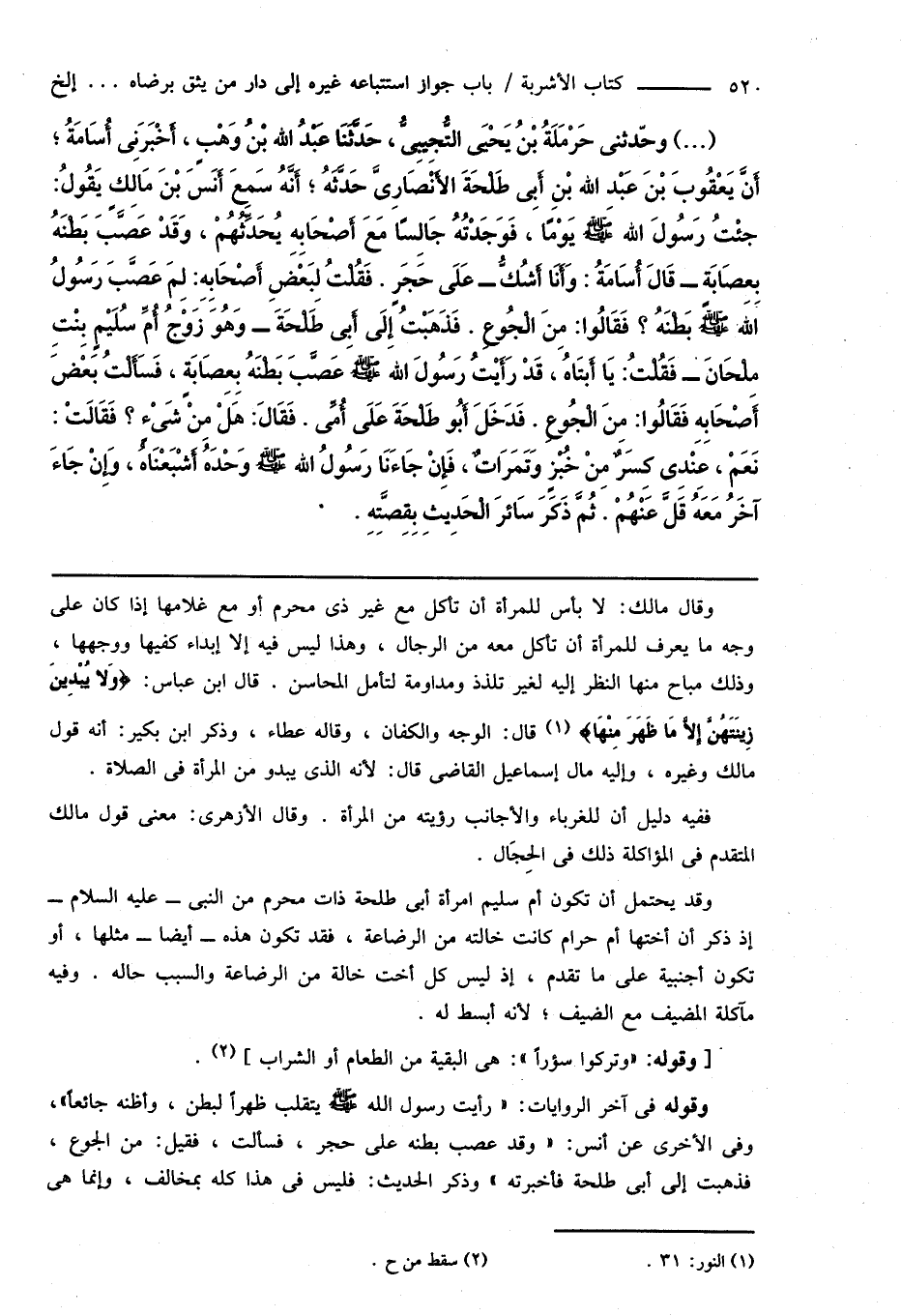 (...) وحدّثنى حَرْمَلَةُ بْنُ يَحْيَى التُّجِيبِىُّ، حَدَّثَنَا عَبْدُ اللهِ بْنُ وَهْبٍ، أَخْبَرَنِى أُسَامَةُ؛ أَنَّ يَعْقُوبَ بْنَ عَبْدِ اللهِ بْنِ أَبِى طَلْحَةَ الأَنْصَارِىَّ حَدَّثَهُ؛ أَنَّهُ سَمِعَ أَنَسَ بْنَ مَالِكٍ يَقُولُ: جِئْتُ رَسُولَ اللهِ صَلَّى اللهُ عَلَيْهِ وَسَلَّمَ يَوْمًا، فَوَجَدْتُهُ جَالِسًا مَعَ أَصْحَابِهِ يُحَدِّثُهُمْ، وَقَدْ عَصَّبَ بَطْنَهُ بِعِصَابَةٍ - قَالَ أُسَامَةُ: وَأَنَا أَشُكُّ - عَلَى حَجَرٍ. فَقُلْتُ لِبَعْضَ أَصْحَابِهِ: لِمَ عَصَّبَ رَسُولُ اللهِ صَلَّى اللهُ عَلَيْهِ وَسَلَّمَ بَطْنَهُ؟ فَقَالُوا: مِنَ الْجُوعِ. فَذَهَبْتُ إِلَى أَبِى طَلْحَةَ - وَهُوَ زَوْجُ أُمِّ سُلَيْمٍ بِنْتِ مِلْحَانَ - فَقُلْتُ: يَا أَبَتَاهُ، قَدْ رَأَيْتُ رَسُولَ اللهِ صَلَّى اللهُ عَلَيْهِ وَسَلَّمَ عَصَّبَ بَطْنَهُ بِعِصَابَةٍ، فَسَأَلْتُ بَعْضَ أَصْحَابِهِ فَقَالُوا: مِنَ الْجُوعِ. فَدَخَلَ أَبُو طَلْحَةَ عَلَى أُمِّى. فَقَالَ: هَلْ مِنْ شَىْءٍ؟ فَقَالَتْ: نَعَمْ، عِنْدِى كِسَرٌ مِنْ خُبْزٍ وَتَمَرَاتٌ، فَإِنْ جَاءَنَا رَسُولُ اللهِ صَلَّى اللهُ عَلَيْهِ وَسَلَّمَ وَحْدَهُ أَشْبَعْنَاهُ، وَإِنْ جَاءَ آخَرُ مَعَهُ قَلَّ عَنْهُمْ. ثُمَّ ذَكَرَ سَائِرَ الْحَدِيثِ بِقِصَّتِهِ.