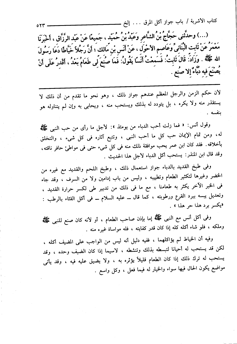(...) وحدَّثنى حَجَّاجُ بْنُ الشَّاعِرِ وَعَبْدُ بْنُ حُمَيْدٍ، جَمِيعًا عَنْ عَبْدِ الرَّزَّاقِ، أَخْبَرَنَا مَعْمَرُ، عَنْ ثَابِتٍ الْبُنَانِىِّ وَعَاصِم الأَحْوَلِ، عَنْ أَنَسِ بْنِ مَالِكٍ؛ أَنَّ رَجُلاً خَيَّاطًا دَعَا رَسُولَ اللهِ صَلَّى اللهُ عَلَيْهِ وَسَلَّمَ. وزَادَ: قَالَ ثَابِتُ: فَسَمِعْتُ أَنَسًا يَقُولُ: فَمَا صُنِعَ لِى طَعَامٌ بَعْدُ، أَقْدِرُ عَلَى أَنْ يُصْنَعَ فِيهِ دُبَّاءٌ إِلا صُنِع.