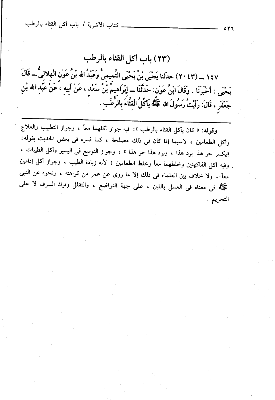 147 - (2043) حدَّثنا يَحْيَى بْن يَحْيَى التَّمِيمِىُّ وَعَبْدُ اللهِ بْنُ عَوْنٍ الْهِلالِىُّ - قَالَ يَحْيَى: أَخْبَرَنَا. وَقَالَ ابْنُ عَوْنٍ: حَدَّثَنَا - إِبْرَاهِيمُ بْنُ سَعْدٍ، عَنْ أَبِيهِ، عَنْ عَبْدِ اللهِ بْنِ جَعْفَرٍ، قَالَ: رَأَيْتُ رَسُولَ اللهِ صَلَّى اللهُ عَلَيْهِ وَسَلَّمَ يَأكُلُ القِثَّاءَ بِالرُّطَبِ.