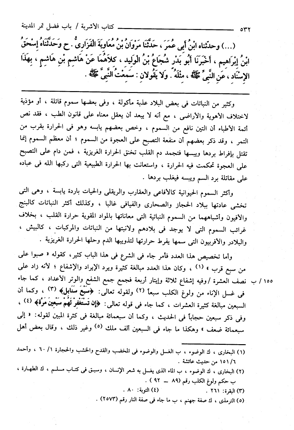 وكثير من النباتات فى بعض البلاد عذبة مأكولة، وفى بعضها سموم قاتلة، أو مؤذية لاختلاف الأهوية والأراضى، مع أنه لا يبعد أن يعقل معناه على قانون الطب، فقد نص أئمة الأطباء أن التين نافع من السموم، وخص بعضهم يابسه وهو فى الحرارة بقرب من التمر، وقد ذكر بعضهم أن منفعة التصبح على العجوة من السموم؛ أن معظم السموم إنما تقتل لإفراط بردها ويبسها فتجمد دم القلب تخنق الحرارة الغريزية، فمن دام على التصبح على العجوة تحكمت فيه الحرارة، واستعانت بها الحرارة الطبيعية التى ركبها الله فى عباده على مقاتلة برد السم ويبسه فيغلب بردها.