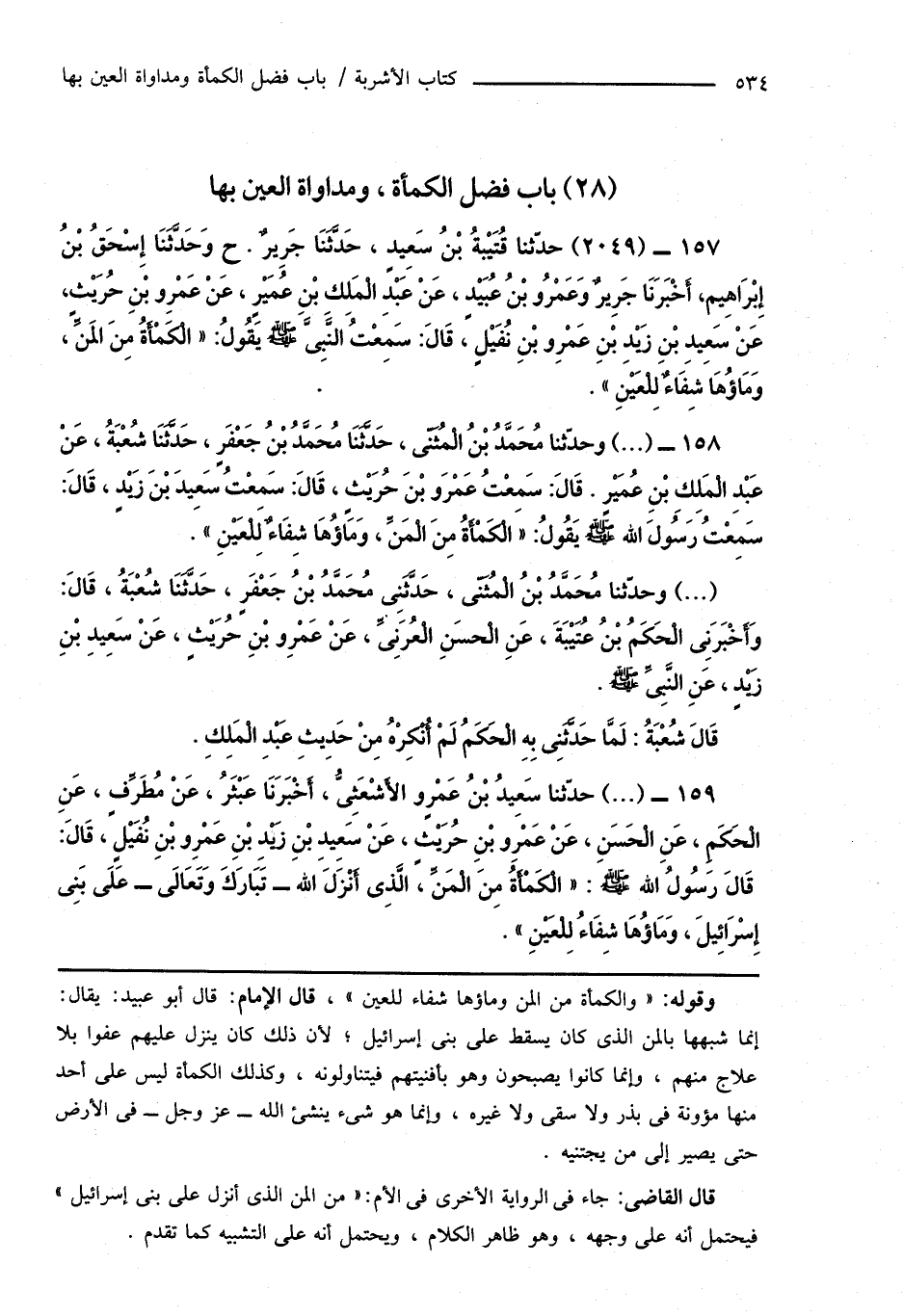 157 - (2049) حدَّثنا قُتَيْبَةُ بْنُ سَعِيدٍ، حَدَّثَنَا جَرِيرٌ. ح وَحَدَّثَنَا إِسْحَاقُ بْنُ إِبْرَاهِيم، أَخْبَرَنَا جَرِيرٌ وَعَمْرُو بْنُ عُبَيْدٍ، عَنْ عَبْدِ الْمَلِكِ بْنِ عُمَيْرٍ، عَنْ عَمْرِو بْنِ حُرَيْثٍ، عَنْ سَعِيدِ بْنِ زَيْدِ بْنِ عَمْرِو بْنِ نُفَيْلٍ، قَالَ: سَمِعْتُ النَّبِىَّ صَلَّى اللهُ عَلَيْهِ وَسَلَّمَ يَقُولُ: " الْكَمْأَةُ مِنَ المَنِّ، وَمَاؤُهَا شِفَاءٌ لِلْعَيْنَ ".