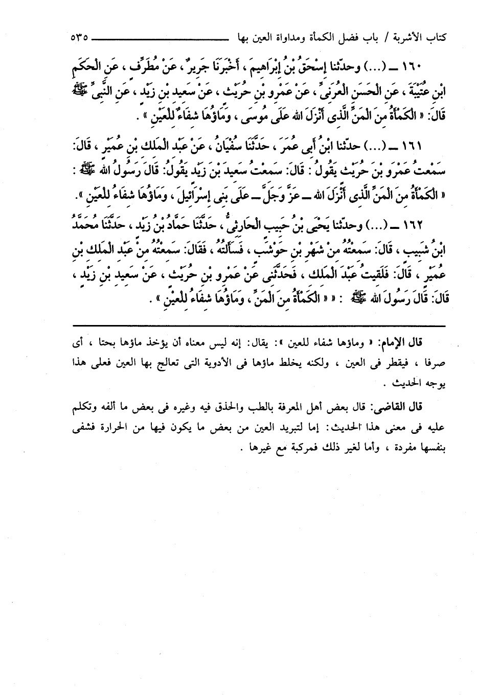 162 - (...) وحدّثنا يَحْيَى بْنُ حَبِيبٍ الْحَارِثِىُّ، حَدَّثَنَا حَمَّادُ بْنُ زَيْدٍ، حَدَّثَنَا مُحَمَّدُ ابْنُ شَبِيبٍ، قَالَ: سَمِعْتُهُ مِنْ شَهْرِ بْنِ حَوْشَبٍ، فَسَأَلْتُهُ، فَقَالَ: سَمِعْتُهُ مِنْ عَبْدِ الْمَلِكِ بْنِ عُمَيْرٍ، قَالَ: فَلَقِيْتُ عَبْدَ الْمَلِكِ، فَحَدَّثَنِى عَنْ عَمْرِو بْنِ حُرَيْثٍ، عَنْ سَعِيدِ بْنِ زَيْدٍ، قَالَ: قَالَ رَسُولَ اللهِ صَلَّى اللهُ عَلَيْهِ وَسَلَّمَ: " الْكَمْأَةُ مِنَ الْمَنِّ، وَمَاؤُهَا شِفَاءٌ لِلْعَيْنِ ".