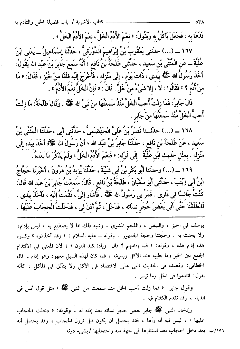 167 - (...) حدّثنى يَعْقُوبُ بْنُ إِبْرَاهِيمَ الدَّوْرَقِىُّ، حَدَّثَنَا إِسْمَاعِيلُ - يَعْنِى ابْنَ عُلَيَّةَ - عَنِ الْمُثَنَّى بْنِ سَعِيدٍ، حَدَّثَنِى طَلْحَةُ بْنُ نَافِعٍ؛ أَنَّهُ سَمِعَ جَابِرَ بْنَ عَبْدِ اللهِ يَقُولُ: أَخَذَ رَسُولُ اللهِ صَلَّى اللهُ عَلَيْهِ وَسَلَّمَ بِيَدِى، ذَاتَ يَوْمٍ، إِلَى مَنْزِلِهِ، فَأَخْرَجَ إِلَيْهِ فِلَقًا مِنْ خُبْزٍ، فَقَالَ: " مَا مِنْ أُدُمٍ؟ " فَقَالُوا: لا، إِلا شَىْءٌ مِنْ خَلٍّ. قَالَ: " فَإِنَّ الْخَلَّ نِعْمَ الأُدُمُ ".
