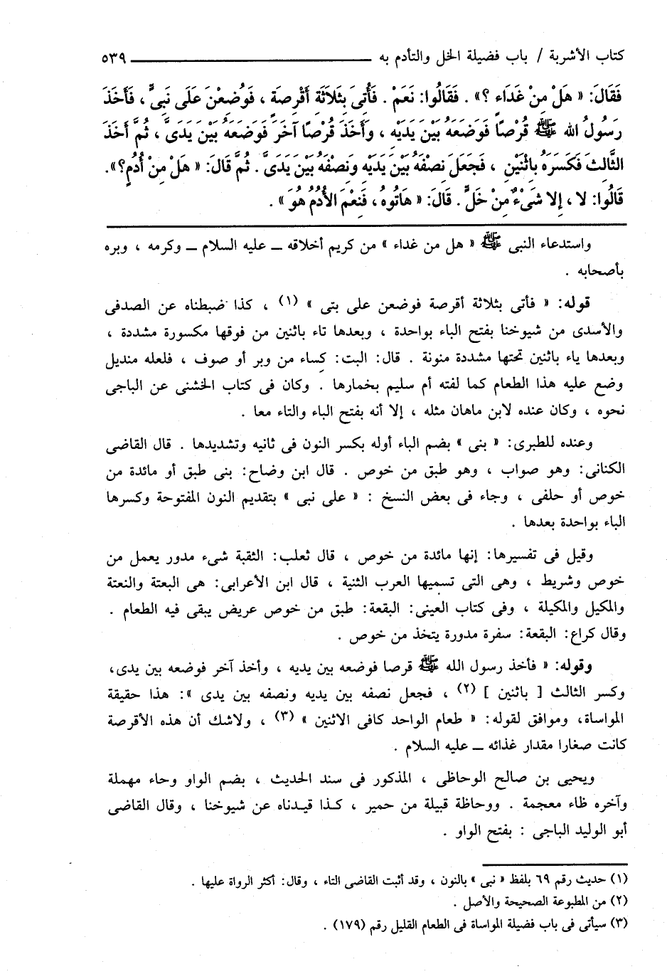 فَقَالَ: " هَلْ مِنْ غَدَاءٍ؟ ". فَقَالُوا: نَعَمْ. فَأُتِىَ بِثَلاثَةِ أَقْرِصَةٍ، فَوُضِعْنَ عَلَى نَبِىٍّ، فَأَخَذَ رَسُولُ اللهِ صَلَّى اللهُ عَلَيْهِ وَسَلَّمَ قُرْصًاً فَوَضَعَهُ بَيْنَ يَدَيْهِ، وَأَخَذَ قُرْصًا آخَرَ فَوَضَعَهُ بَيْنَ يَدَىَّ، ثُمَّ أَخَذَ الثَّالِثَ فَكَسَرَهُ بِاثْنَيْنِ، فَجَعَلَ نِصْفَهُ بَيْنَ يَدَيْهِ وَنِصْفَهُ بَيْنَ يَدَىَّ. ثُمَّ قَالَ: " هَلْ مِنْ أُدُمٍ؟ ". قَالُوا: لا، إِلا شَىْءٌ مِنْ خَلٍّ. قَالَ: " هَاتُوهُ، فَنِعْمَ الأُدُمُ هُوَ ".
