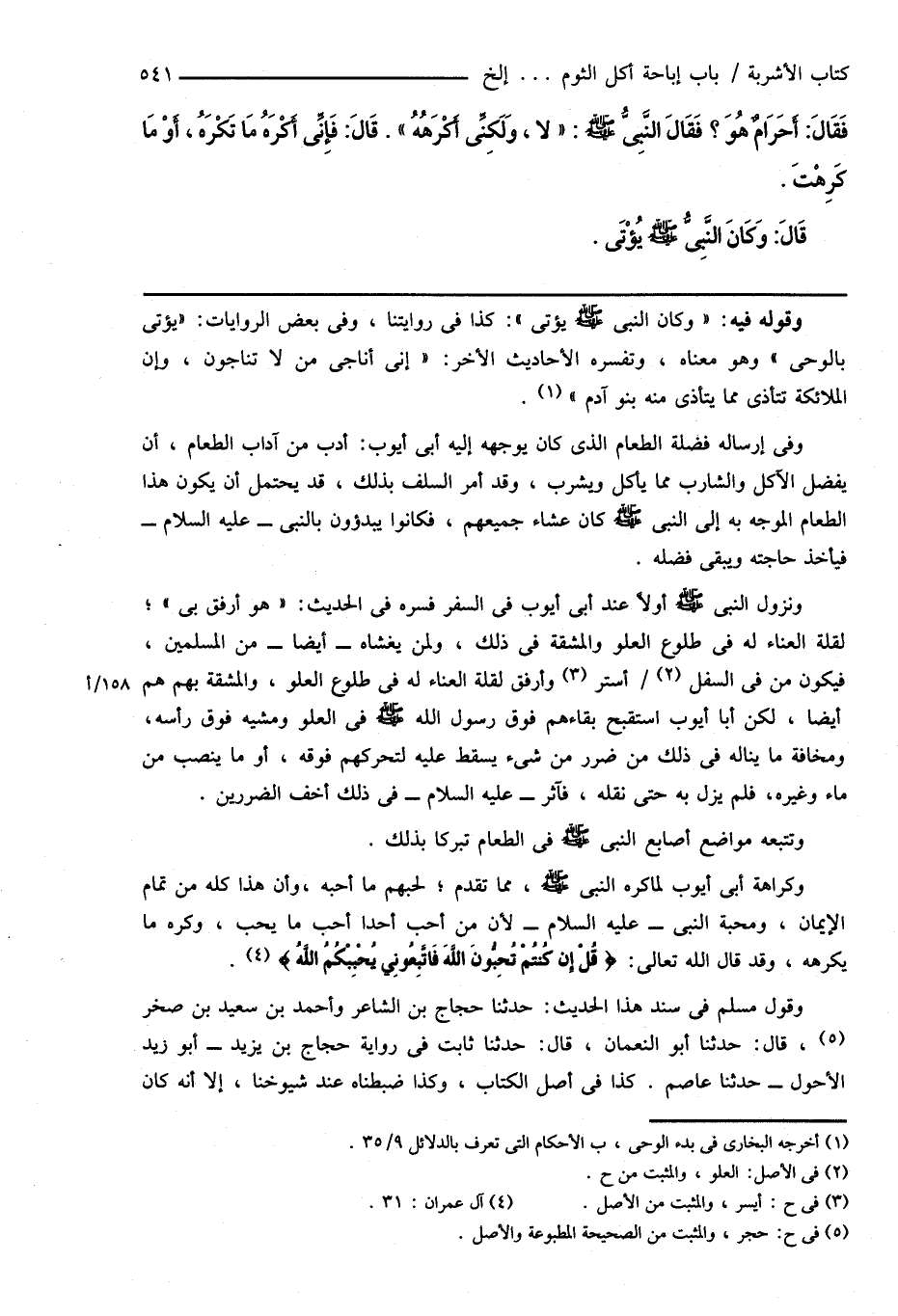 وقوله فيه: " وكان النبى صَلَّى اللهُ عَلَيْهِ وَسَلَّمَ يؤتى ": كذا فى روايتنا، وفى بعض الروايات: " يؤتى بالوحى " وهو معناه، وتفسره الأحاديث الأخر: " إنى أناجى من لا تناجون، وإن الملائكة تتأذى مما يتأذى منه بنو آدم " (¬1).