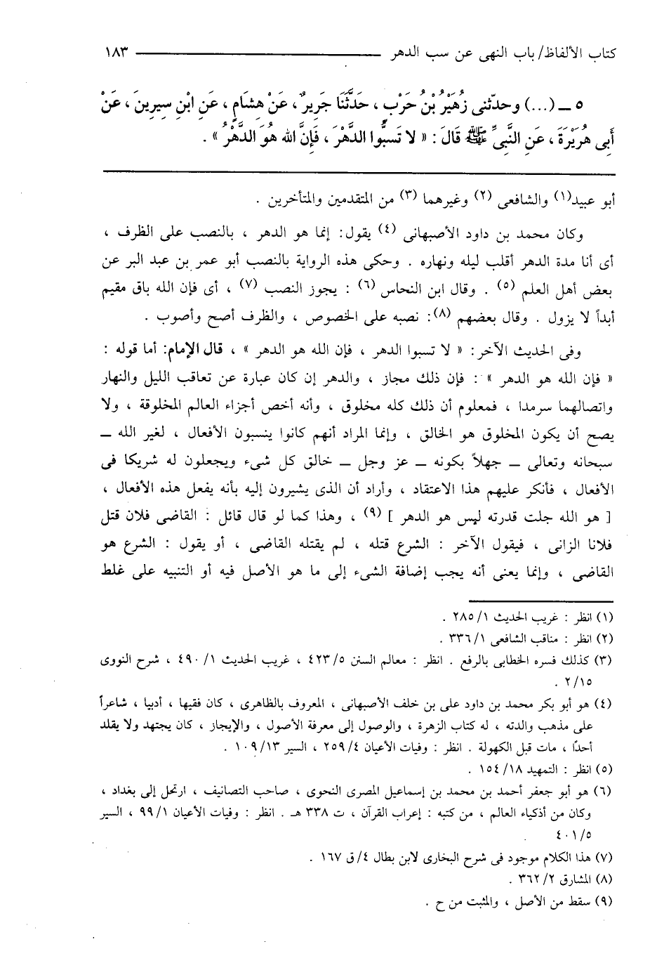 5 - (...) وحدّثنى زُهَيْرُ بْنُ حَرْبٍ، حَدَّثَنَا جَرِيرٌ، عَنْ هِشَامٍ، عَنِ ابْنِ سِيرِينَ، عَنْ أَبِى هُرَيْرَةَ، عَنِ النَّبِىِّ صَلَّى اللَّهُ عَلَيْهِ وَسَلَّمَ قَالَ: " لا تَسبُّوا الدَّهْرَ، فَإِنَّ الله هُوَ الدَّهْرُ ".