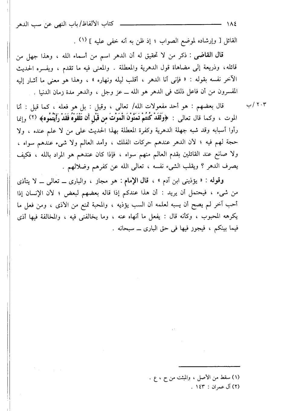 قال بعضهم: هو أحد مفعولات الله تعالى، وقيل: بل هو فعله، كما قيل: أنا الموت، وكما قال تعالى: {وَلَقَدْ كُنْتُمْ تَمَنَّوْنَ الْمَوْتَ مِن قَبْلِ أَن تَلْقَوْهُ فَقَدْ رَأَيْتُمُوه} (¬2) وإنما رأوا أسبابه وقد شبه جهلة الدهرية وكفرة المعطلة بهذا الحديث على من لا علم عنده، ولا حجة لهم فيه؛ لأن الدهر عندهم حركات الفلك، وأمد العالم ولا شىء عندهم سواه، ولا صانع عند القائلين بقدم العالم منهم سواه، فإذا كان عندهم هو المراد بالله، فكيف يصرف الدهر؟ ويقلب الشىء نفسه، تعالى الله عن كفرهم وضلالهم.