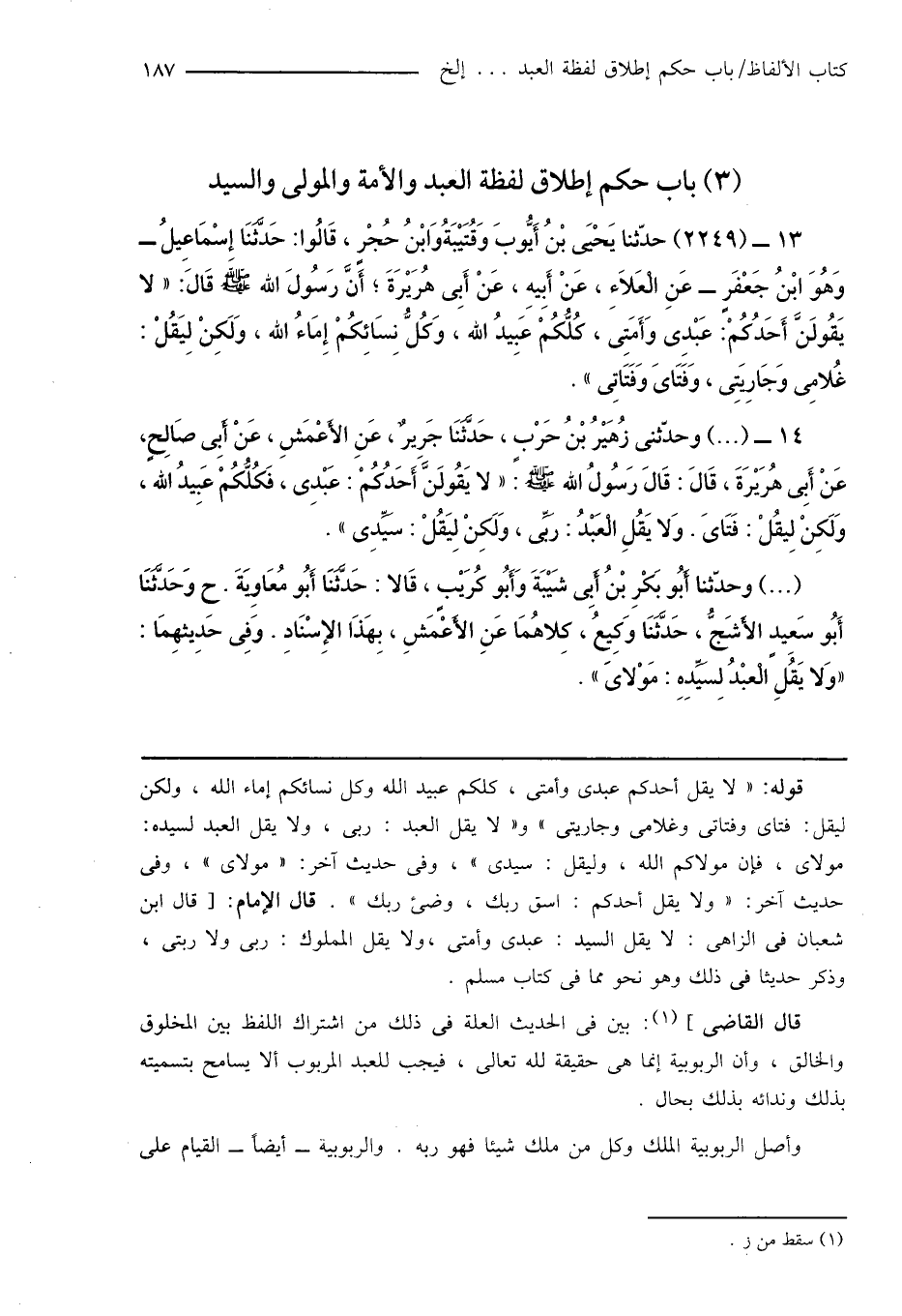 قوله: " لا يقل أحدكم عبدى وأمتى، كلكم عبيد الله وكل نسائكم إماء الله، ولكن ليقل: فتاى وفتاتى وغلامى وجاريتى " و" لا يقل العبد: ربى، ولا يقل العبد لسيده: مولاى، فإن مولاكم الله، وليقل: سيدى "، وفى حديث آخر: " مولاى "، وفى حديث آخر: " ولا يقل أحدكم: اسق ربك، وضئ ربك ". قال الإمام: [قال ابن شعبان فى الزاهى: لا يقل السيد: عبدى وأمتى، ولا يقل المملوك: ربى ولا ربتى، وذكر حديثاً فى ذلك وهو نحو مما فى كتاب مسلم.
