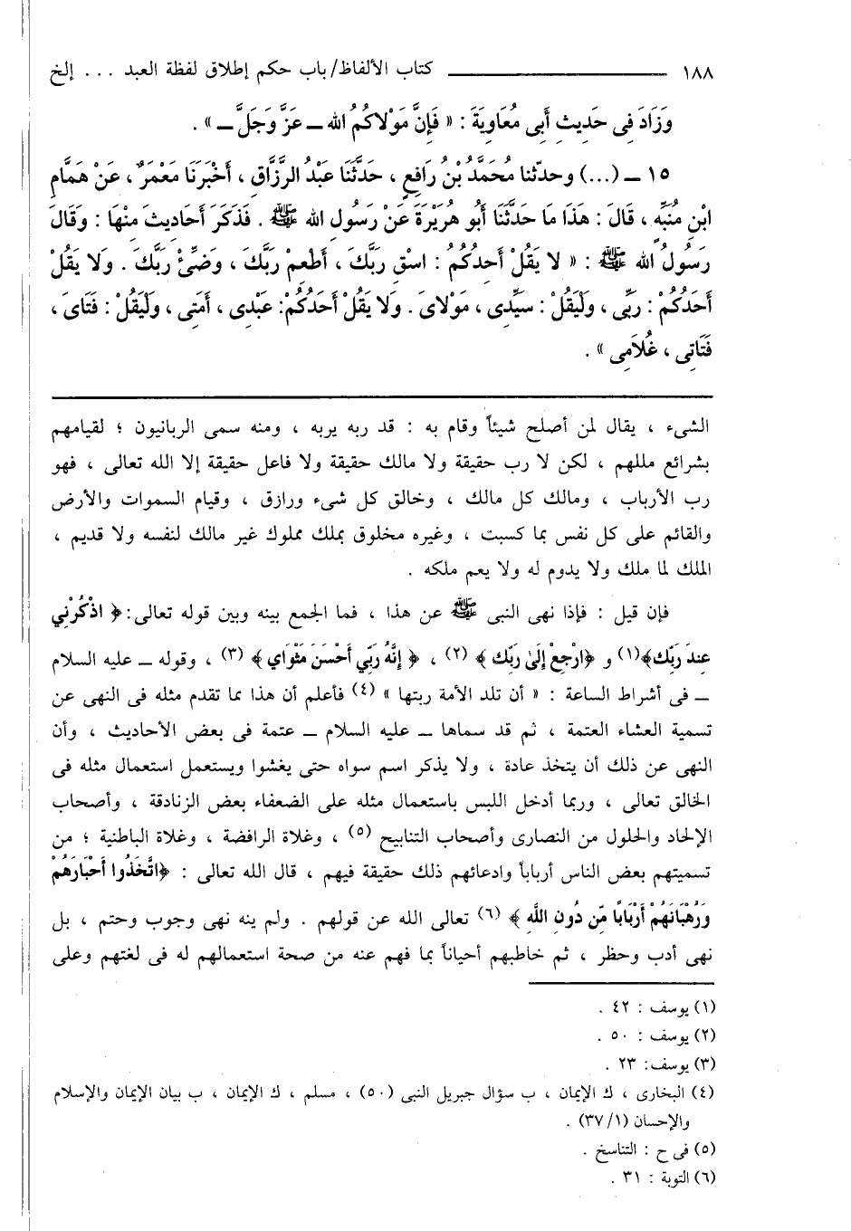 فإن قيل: فإذا نهى النبى صَلَّى اللَّهُ عَلَيْهِ وَسَلَّمَ عن هذا، فما الجمع بينه وبين قوله تعالى: {اذْكُرْنِي عِندَ رَبِّك} (¬1) و {ارْجِعْ إِلَى رَبِّك} (¬2)، {إِنَّهُ رَبِّي أَحْسَنَ مَثْوَاي} (¬3)، وقوله - عليه السلام - فى أشراط الساعة: " أن تلد الأمة ربتها " (¬4) فأعلم أن هذا مما تقدم مثله فى النهى عن تسمية العشاء العتمة، تم قد سماها - عليه السلام - عتمة فى بعض الأحاديث، وأن النهى عن ذلك أن يتخذ عادة، ولا يذكر اسم سواه حتى يغشوا ويستعمل استعمال مثله فى الخالق تعالى، وربما أدخل اللبس باستعمال مثله على الضعفاء بعض الزنادقة، وأصحاب الإلحاد والحلول من النصارى وأصحاب التنابيح (¬5)، وغلاة الرافضة، وغلاة الباطنية؛ من تسميتهم بعض الناس أرباباً وادعائهم ذلك حقيقة فيهم، قال الله تعالى: {اتَّخَذُوا أَحْبَارَهُمْ وَرُهْبَانَهُمْ أَرْبَابًا مِّن دُونِ اللَّهِ} (¬6) تعالى الله عن قولهم. ولم ينه نهى وجوب وحتم، بل نهى أدب وحظر، ثم خاطبهم أحياناً بما فهم عنه من صحة استعمالهم له فى لغتهم وعلى