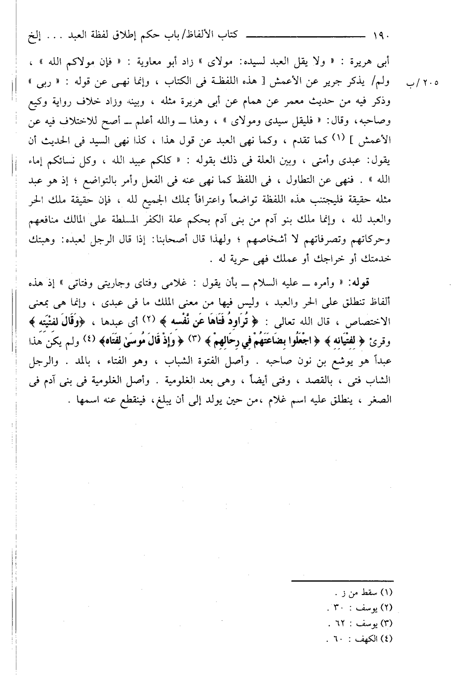 قوله: " وأمره - عليه السلام - بأن يقول: غلامى وفتاى وجاريتى وفتاتى " إذ هذه ألفاظ تنطلق على الحر والعبد، وليس فيها من معنى الملك ما فى عبدى، وإنما هى بمعنى الاختصاص، قال الله تعالى: {تُرَاوِدُ فَتَاهَا عَن نَّفْسِه} (¬2) أى عبدها، {وَقَالَ لفِتْيَتِهِ} وقرئ {لِفِتْيَانِهِ} {اجْعَلُوا بِضَاعَتَهُمْ فِي رِحَالِهِمْ} (¬3) {وَإِذْ قَالَ مُوسَى لِفَتَاه} (¬4) ولم يكن هَذا عبداً هو يوشع بن نون صاحبه. وأصل الفتوة الشباب، وهو الفتاء، بالد. والرجل الشاب فتى، بالقصد، وفتى أيضاً، وهى بعد الغلومية. وأصل الغلومية فى بنى آدم فى الصغر، ينطلق عليه اسم غلام، من حين يولد إلى أن يبلغ، فينقطع عنه اسمها.