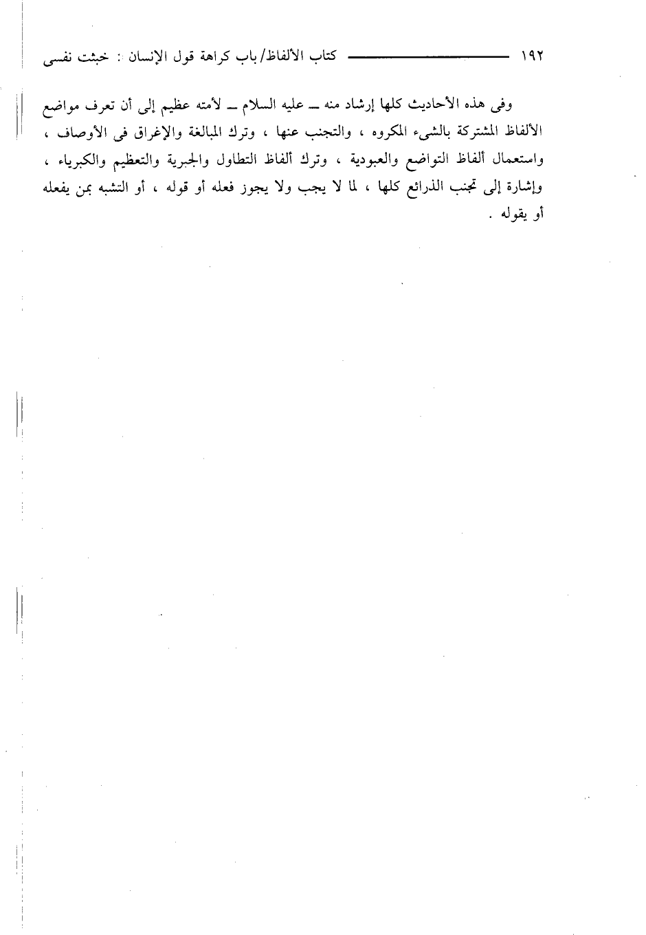 وفى هذه الأحاديث كلها إرشاد منه - عليه السلام - لأمته عظيم إلى أن تعرف مواضع الألفاظ المشتركة بالشىء المكروه، والتجنب عنها، وترك المبالغة والإغراق فى الأوصاف، واستعمال ألفاظ التواضع والعبودية، وترك ألفاظ التطاول والجبرية والتعظيم والكبرياء، وإشارة إلى تجنب الذرائع كلها، لما لا يجب ولا يجوز فعله أو قوله، أو التشبه بمن يفعله أو يقوله.