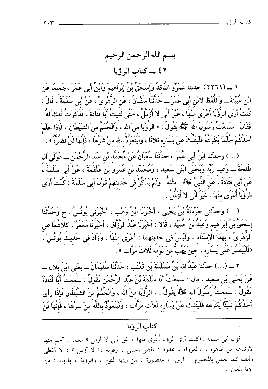 1 - (2261) حدّثنا عَمْرٌو النَّاقِدُ وَإِسْحَاقُ بْنُ إِبْرَاهِيمَ وَابْنُ أَبِى عَمَرَ، جَمِيعًا عَنِ ابْنِ عُيَيْنةَ - وَاللَّفْظ لابْنِ أَبِى عُمَرَ - حَدَّثَنَا سُفْيانُ، عَنِ الزُّهْرِىِّ، عَنْ أَبِى سَلَمَةَ، قَالَ: كُنْتُ أَرَى الرُّؤْيَا أُعْرَى مِنْهَا، غَيْرَ أَنَّى لا أُزَمَّلُ، حَتَّى لَقِيتُ أَبَا قَتَادَةَ، فَذَكَرْتُ ذَلِكَ لهُ. فَقَالَ: سَمِعْتُ رَسُولَ اللهِ صَلَّى اللَّهُ عَلَيْهِ وَسَلَّمَ يَقُولُ: " الرُّؤْيَا مِنَ اللهِ، وَالْحُلْمُ مِنَ الشَّيْطَانِ، فَإِذا حَلَمَ أَحَدُكُمْ حُلْمًا يَكْرَهُهُ فَلْيَنْفُثْ عَنْ يَسَارِهِ ثَلاثًا، وَلَيَتَعَوَّذْ بِاللهِ مِنْ شَرِّهَا، فَإِنَّهَا لَنْ تضُرَّهُ ".