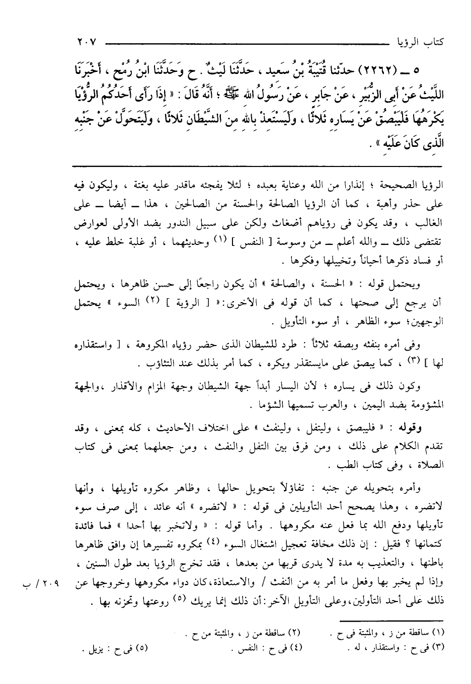 5 - (2262) حدّثنا قُتَيْبَةُ بْنُ سَعِيدٍ، حَدَّثَنَا لَيْثٌ. ح وَحَدَّثَنَا ابْنُ رُمْح، أَخْبَرَنَا اللَّيْثُ عَنْ أَبِى الزُّبَيْرِ، عَنْ جَابِرٍ، عَنْ رَسُولُ اللهِ صَلَّى اللَّهُ عَلَيْهِ وَسَلَّمَ؛ أَنَّهُ قَالَ: " إِذَا رَأَى أَحَدُكُمُ الرُّؤْيَا يَكْرَهُهَا فَلْيَبْصُقْ عَنْ يَسَارِهِ ثَلاثًا، وَلْيَسْتَعِذْ بِاللهِ مِنَ الشَّيْطَانِ ثَلاثًا، وَلْيَتَحَوَّلْ عَنْ جَنْبِهِ الَّذِى كَانَ عَلَيْهِ ".