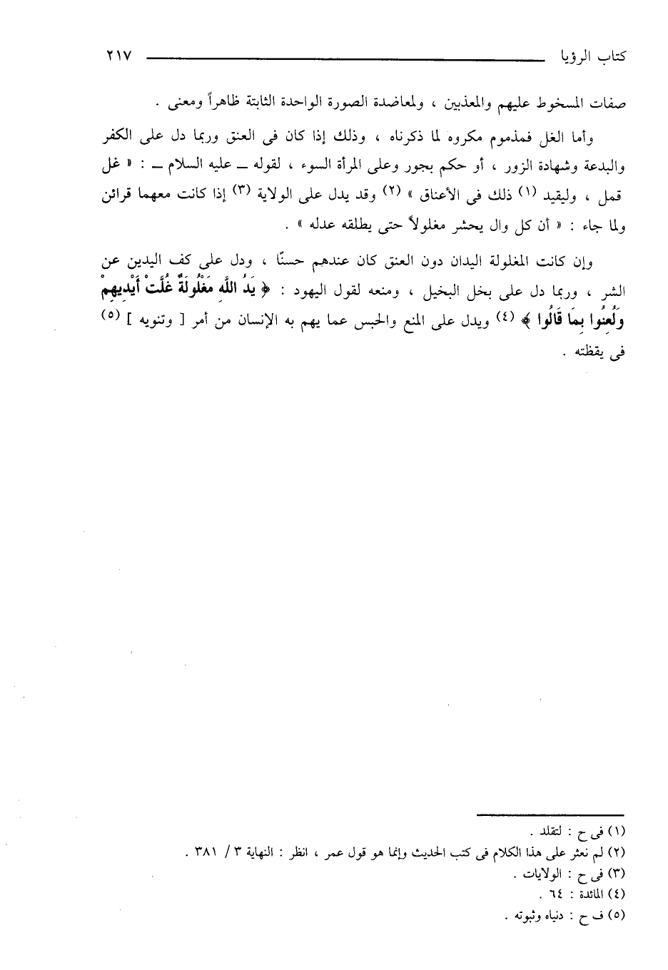 وإن كانت المغلولة اليدان دون العنق كان عندهم حسنًا، ودل على كف اليدين عن الشر، وربما دل على بخل البخيل، ومنعه لقول اليهود: {يَدُ اللَّهِ مَغْلُولَةٌ غُلَّتْ أَيْدِيهِمْ وَلُعِنُوا بِمَا قَالُوا} (¬4) ويدل على المنع والحبس عما يهم به الإنسان من أمر [وتنويه] (¬5) فى يقظته.