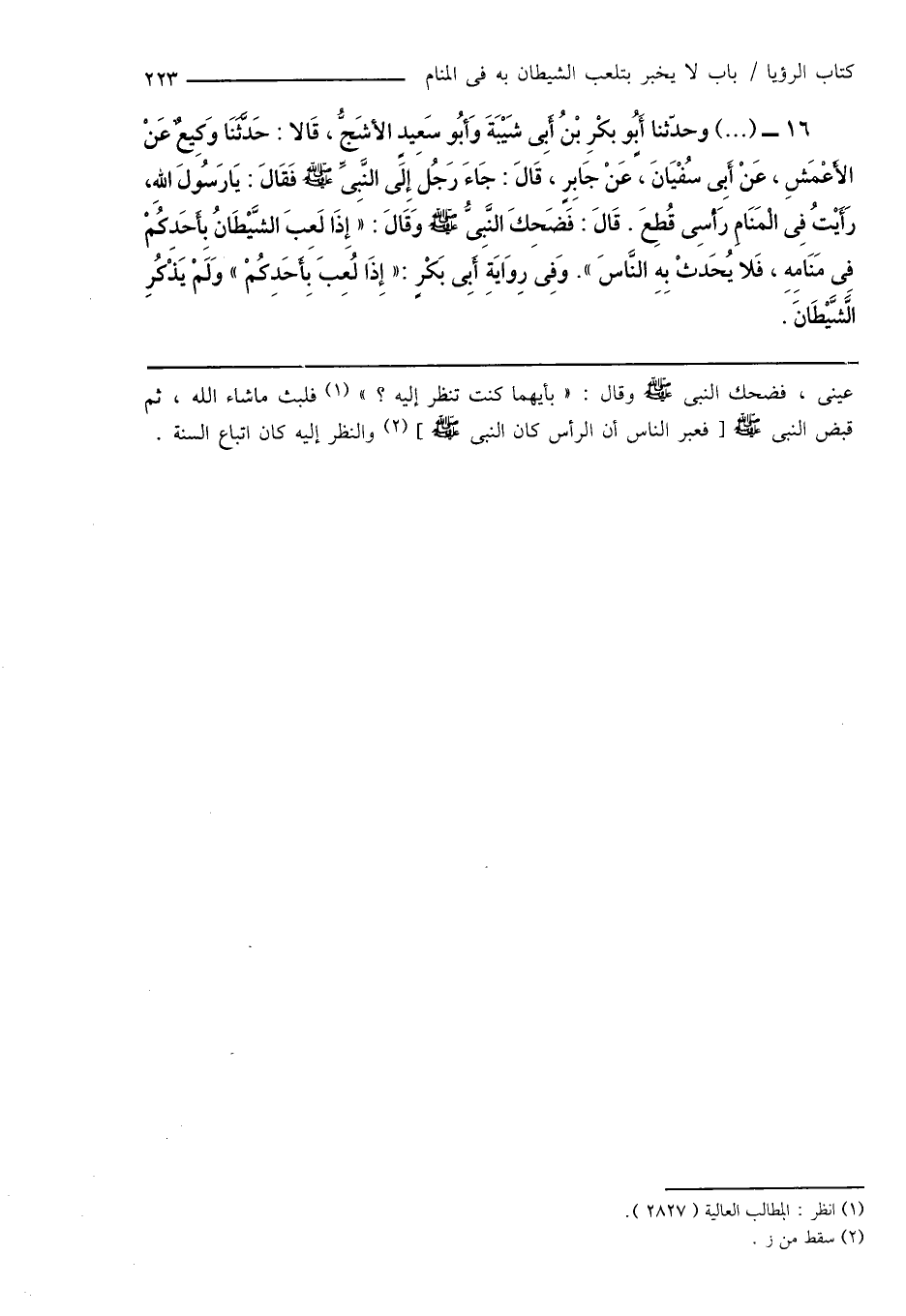 16 - (...) وحدّثنا أَبُو بَكْرِ بْنُ أَبِى شَيْبَةَ وَأَبُو سَعِيدٍ الأَشَجُّ، قَالا: حَدَّثَنَا وَكِيعٌ عَنْ الأَعْمَشِ، عَنْ أَبِى سُفْيَانَ، عَنْ جَابِرٍ، قَالَ: جَاءَ رَجُل إِلَى النَّبِىِّ صَلَّى اللَّهُ عَلَيْهِ وَسَلَّمَ فَقَالَ: يَا رَسُولَ اللهِ، رَأَيْتُ فِى الْمَنَامِ رَأْسِى قُطِعَ. قَالَ: فَضَحِكَ النَّبِىُّ صَلَّى اللَّهُ عَلَيْهِ وَسَلَّمَ وَقَالَ: " إِذَا لَعِبَ الشَّيْطَانُ بِأَحَدِكُمْ فِى مَنَامِهِ، فَلا يُحَدثْ بِهِ النَّاسَ ". وَفِى رِوَايَةِ أَبِى بَكْرٍ: " إِذَا لُعِبَ بِأَحَدِكُمْ " وَلَمْ يَذْكُرِ الشَّيْطَانَ.