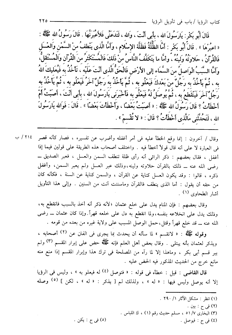 قَالَ أَبُو بَكْرٍ: يَا رَسُولَ اللهِ، بِأَبِى أَنْتَ، وَاللهِ، لَتَدَعَنِّى فَلأَعُبَرَنَّهَا. قَالَ رَسُولُ اللهِ صَلَّى اللَّهُ عَلَيْهِ وَسَلَّمَ: " اعبُرْهَا ". قَالَ أَبُو بَكْرٍ: أَمَّاَ الظُّلَّةُ فَظَلَّة الإِسْلامِ، وَأَمَّا الَّذِى يَنْطِفُ مِنْ السَّمْنِ وَالعْسَلِ فَالْقُرْآنُ، حَلاوَتُهُ وَلِينُهُ، وأمَّا ما يَتَكَفَّفُ النَّاسُ مِنْ ذَلِكَ فَالْمُسْتَكْثِرُ مِنَ الْقُرْآنِ وَالْمُسْتَقِلُّ، وَأَمَّا السّبَبُ الْوَاصِلُ مِنَ السَّمَاءِ إلى الأَرْضِ فَالْحَقُّ الَّذِى أَنْتَ عَلَيْهِ، تَأخُذُ بِهِ فَيُعَلِيكَ اللهُ بِهِ، ثُمَّ يَأخُذُ بِهِ رَجُلٌ مِنْ بَعْدِكَ فَيَعْلُو بِهِ، ثُمَّ يَأخُذُ بِهِ رَجُلٌ آخَرُ فَيَعْلُو بِهِ، ثُمَّ يَأخُذُ بِهِ رَجُلٌ آخَرَ فَيَنْقَطِعُ بِهِ، ثُمَّ يُوصَلُ لَهُ فَيَعْلُو بِهِ فَأَخْبَرَنِى يَا رَسُولَ اللهِ، بِأَبِى أَنْتَ، أَصَبْتُ أَمْ أَخْطَأتُ؟ قَالَ رَسُولُ الله صَلَّى اللَّهُ عَلَيْهِ وَسَلَّمَ: " أَصَبْتُ بَعْضًا، وَأَخْطَأتَ بَعْضًا ". قَالَ: فَوَاللهِ يَا رَسُولَ اللهِ، لَتَحُدَّثَنِى مَالَّذِى أَخْطَأتُ؟ قَالَ: " لا تُقْسِمْ ".