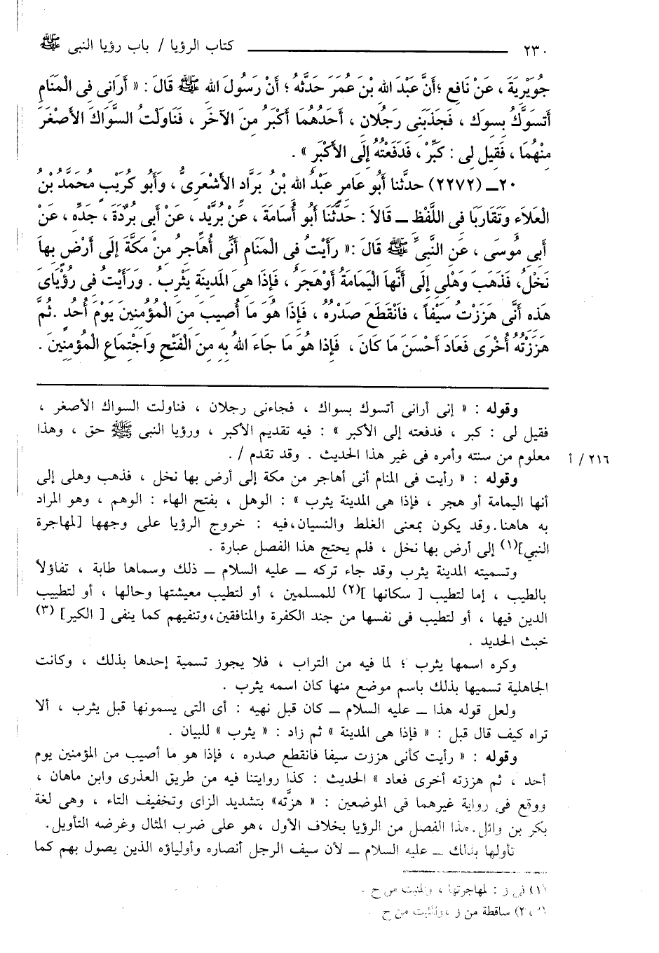 20 - (2272) حدَّثنا أَبُو عَامِرٍ عَبْدُ اللهِ بْنُ بَرَّادٍ الأَشْعَرِىُّ، وَأَبُو كُرَيْبٍ مُحَمَّدُ بْنُ الْعَلاَءِ وَتَقَارَبَا فِى اللَّفْظِ - قَالا: حَدَّثَنَا أَبُو أُسَامَةَ، عَنْ بُرَّيْدٍ، عَنْ أَبِى بُرْدَةَ، جَدِّهِ، عَنْ أَبِى مُوسَى، عَنِ النَّبِىِّ صَلَّى اللَّهُ عَلَيْهِ وَسَلَّمَ قَالَ: " رَأَيْتُ فِى الْمَنَامِ أَنِّى أُهَاجِرُ مِنْ مَكَّةَ إلَى أَرْضٍ بِهَا نَخْلٌ، فَذَهَبَ وَهْلِى إِلَى أَنَّهَا الْيَمَامَةُ أَوْ هَجَرُ، فَإِذَا هِىَ المَدِينَةِ يَثْرِبُ. وَرَأَيْتُ فِى رُؤْيَاىَ هَذِهِ أَنَّى هَزَزْتُ سَيْفاً، فاَنْقَطَعَ صَدْرُهُ، فَإِذَا هُوَ مَا أُصِيبَ مِنَ الْمُؤمِنِينَ يَوْمَ أُحُدٍ. ثُمَّ هَزَزْتُهُ أُخْرَى فَعَادَ أَحْسَنَ مَا كَانَ، فَإِذا هُوَ مَا جَاءَ اللهُ بِهِ مِنَ الْفَتْحِ وَاجْتِمَاعِ الْمُؤمِنِينَ.