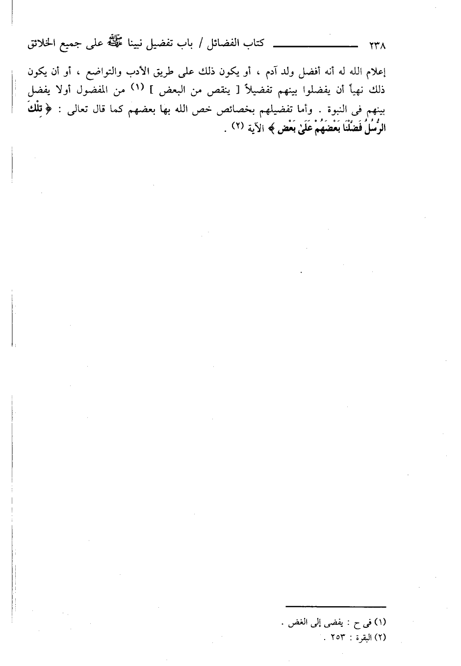 إعلام الله له أنه أفضل ولد آدم، أو يكون ذلك على طريق الأدب والتواضع، أو أن يكون ذلك نهياً أن يفضلوا بينهم تفضيلاً [ينقص من البعض] (¬1) من المفضول أو لا يفضل بينهم فى النبوة. وأما تغيضيلهم بخصائص خص الله بها بعضهم كما قال تعالى: {تِلْكَ الرُّسُلُ فَضَّلْنَا بَعْضَهُمْ عَلَى بَعْض} الآية (¬2).