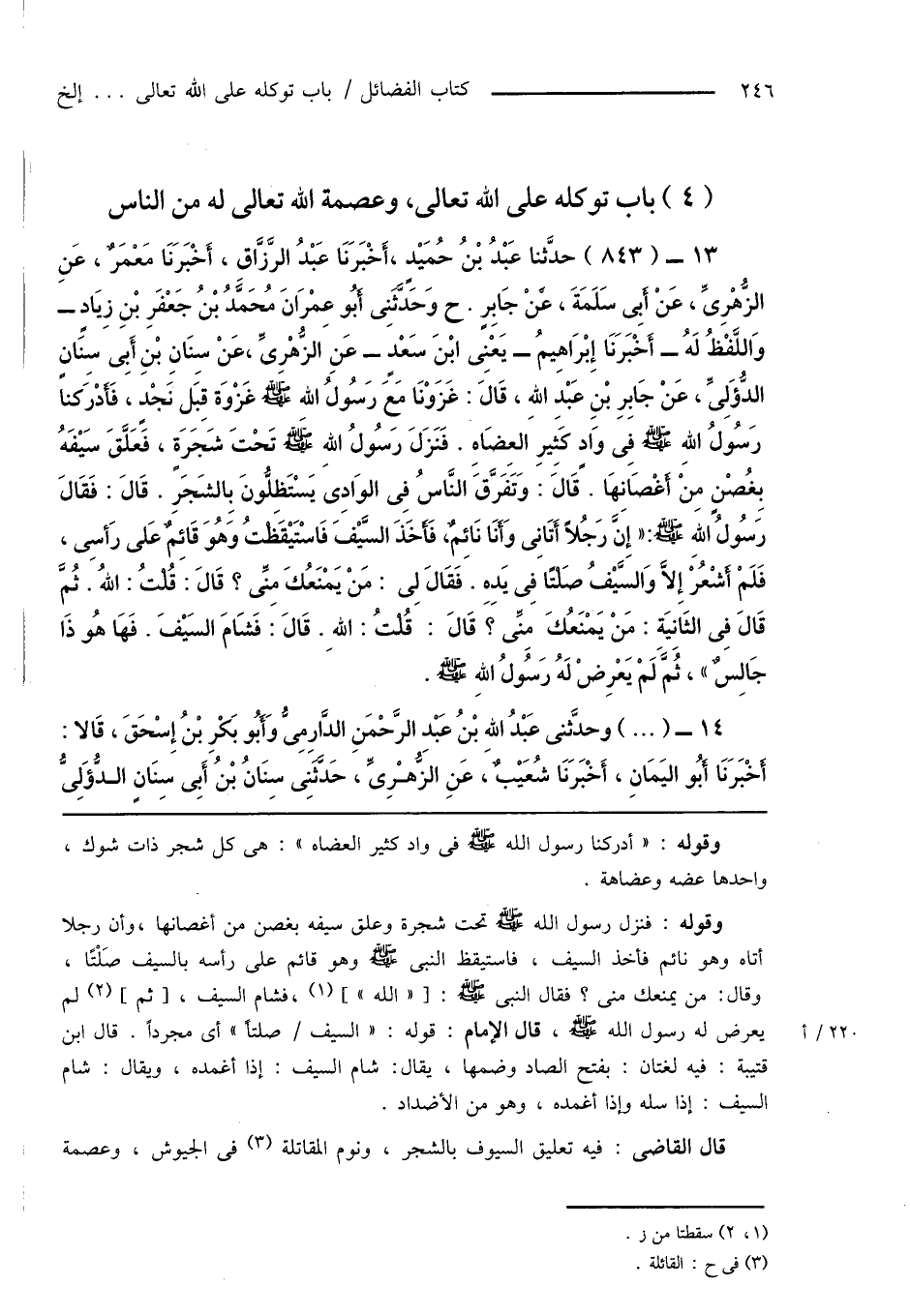 13 - (843) حدَّثنا عَبْدُ بْنُ حُمَيْدٍ، أَخْبَرَنَا عَبْدُ الرَّزَّاقِ، أَخْبَرَنَا مَعْمَرٌ، عَنِ الزُّهْرِىِّ، عَنْ أَبِى سَلَمَةَ، عَنْ جَابِرٍ. ح وَحَدَّثَنِى أَبُو عِمْرَانَ مُحَمَّدُ بْنُ جَعْفَرِ بْنِ زِيَادٍ - وَاللَّفْظُ لَهُ - أَخْبَرَنَا إِبْرَاهِيمُ - يَعْنِى ابْنَ سَعْدٍ - عَنِ الزُّهْرِىِّ، عَنْ سِنَانِ بْنِ أَبِى سِنَانٍ الدُّؤَلِىِّ، عَنْ جَابِرِ بْنِ عَبْدِ اللهِ، قَالَ: غَزَوْنَا مَعَ رَسُولُ اللهِ صَلَّى اللَّهُ عَلَيْهِ وَسَلَّمَ غَزْوَة قِبَل نَجْدٍ، فَأَدْرَكنا رَسُولُ اللهِ صَلَّى اللَّهُ عَلَيْهِ وَسَلَّمَ فِى وَادٍ كَثِيرِ العِضَاهِ. فَنَزَلَ رسُولُ اللهِ صَلَّى اللَّهُ عَلَيْهِ وَسَلَّمَ تَحْتَ شَجَرَةٍ، فعَلَّقَ سَيْفَهُ بِغُصْنٍ مِنْ أَغْصَانِهَا. قَالَ: وَتَفَرَّقَ النَّاسُ فِى الوَادِىَ يَسْتَظِلُّونَ بِالشَجَرِ. قَالَ: فَقَالَ رَسُولُ اللهِ صَلَّى اللَّهُ عَلَيْهِ وَسَلَّمَ: " إِنَّ رَجُلاً أَتَانِى وَأَنَا نَائِمٌ، فَأَخَذَ السَّيْفَ فَاسْتَيْقَظْتُ وَهُوَ قَائِمٌ عَلى رَأسِى، فَلَمْ أَشْعُرْ إِلاَّ وَالسَّيْفُ صَلْتًا فِى يَدِهِ. فَقَالَ لِى: مَنْ يَمْنَعُكَ مِنِّى؟ قَالَ: قُلْتُ: اللهُ. ثُمَّ قَالَ فِى الثَّانِيَةِ: مَنْ يَمْنَعُكَ مِنِّى؟ قَالَ: قُلْتُ: الله. قَالَ: فَشَامَ السَّيْفَ. فَهَا هُوَ ذَا جَالِسٌ "، ثُمَّ لَمْ يَعْرِضْ لَهُ رَسُولُ اللهِ صَلَّى اللَّهُ عَلَيْهِ وَسَلَّمَ.
